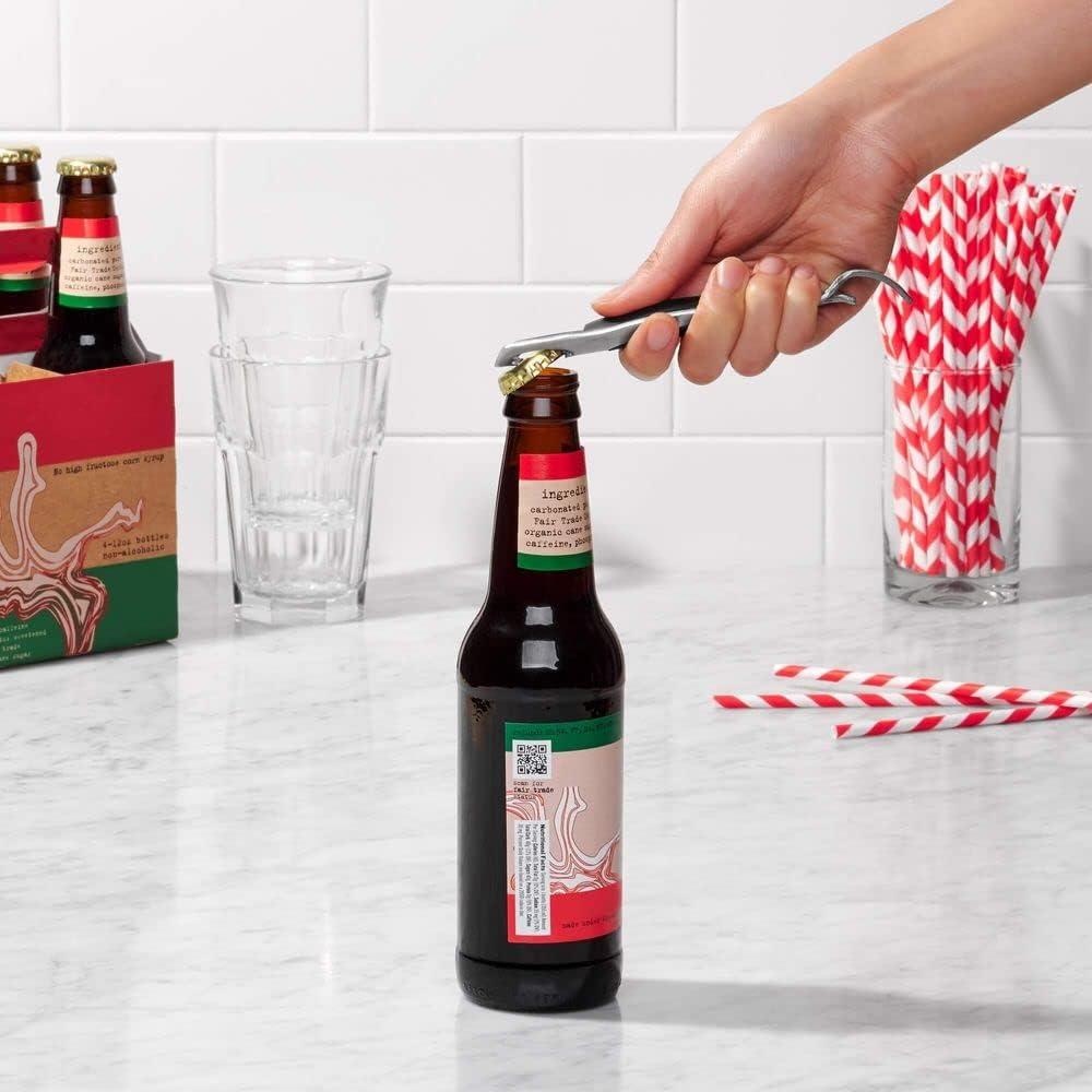 Sleek lines, soft curves and brushed stainless steel bring function and style to the OXO steel bottle opener. The bottle opener has two functional ends, one for opening bottles and the other for punching cans. Soft, non-slip grip.