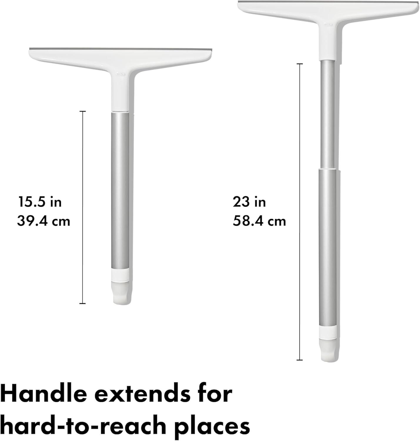 Clean the shower with less reaching and crouching. The OXO Good Grips Aluminum Extendable Squeegee features a rust-free aluminum handle that extends from 15.5 in/39.4 cm to 23 in/58.4 cm so you can easily clear water from those hard-to-reach places. The Squeegee’s durable silicone blade has a design inspired by windshield wipers and features a flexible precision edge for consistent, streak-free drying. Use it to reach every part of your shower glass doors, mirrors, bathroom floors, tiled surfaces, marble countertops – even your car windows. The flexible hook rotates 360° for convenient hanging storage on showerheads, caddies and towel bars.