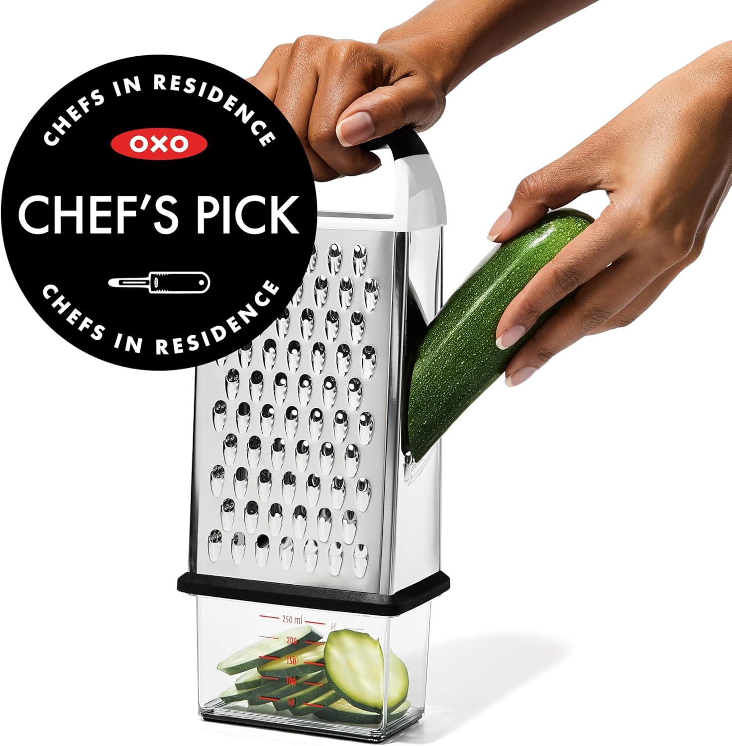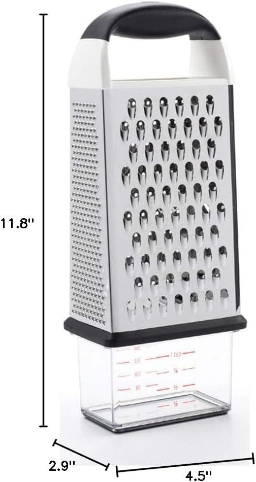Our Box Grater features 4 stainless steel surfaces: 2 wide ones for coarse and medium grating and 2 slimmer ones for fine grating and slicing. A convenient container with non-slip base, measurement markings and lid attaches to the bottom for catching and storing freshly grated ingredients.