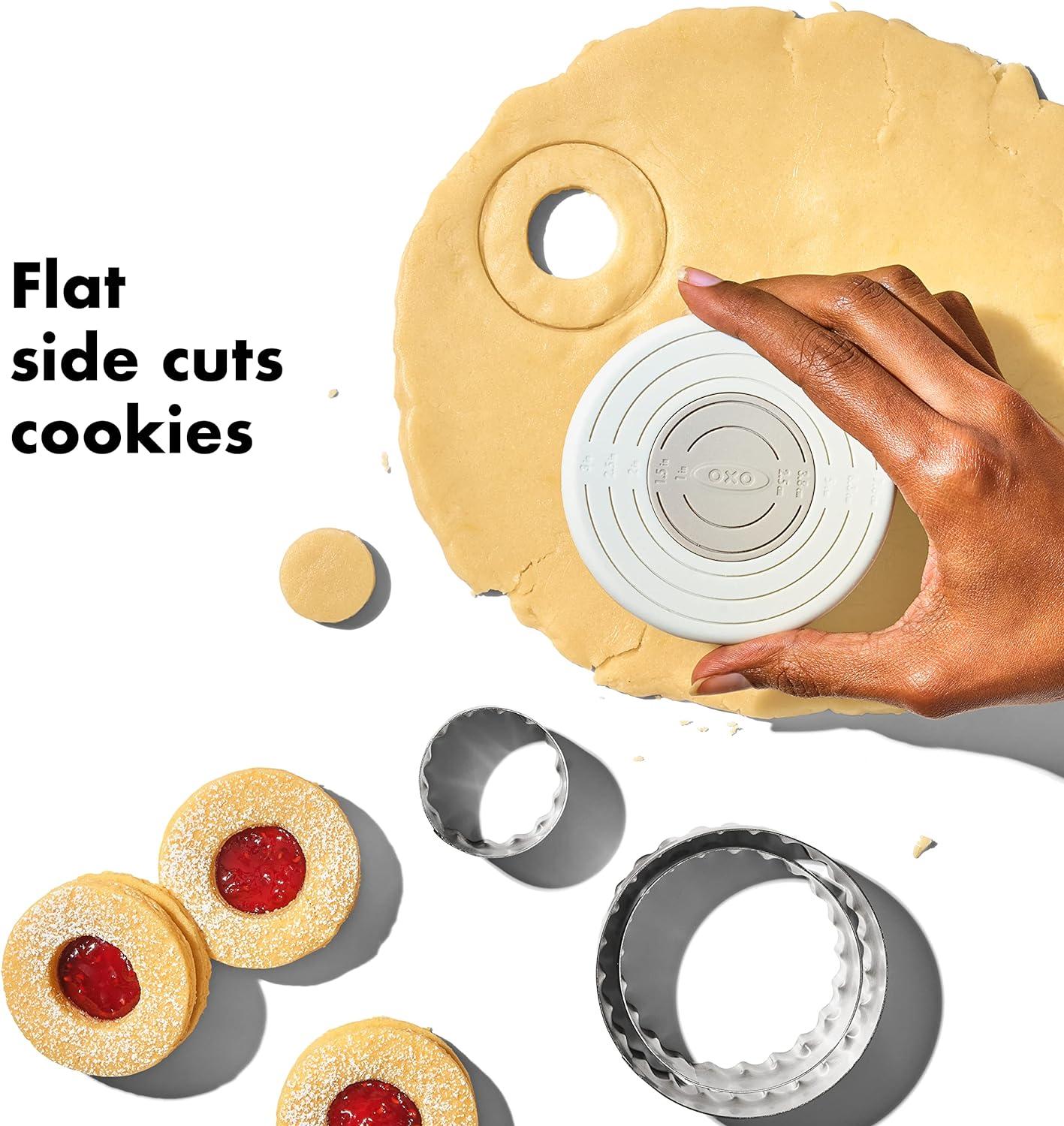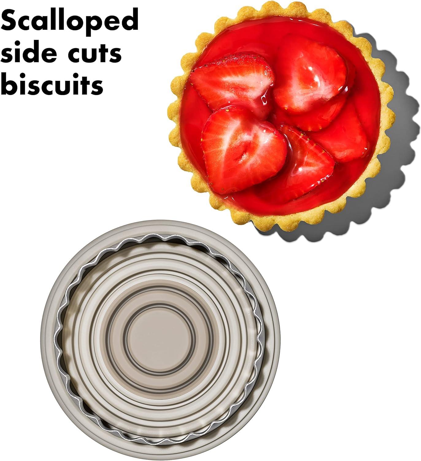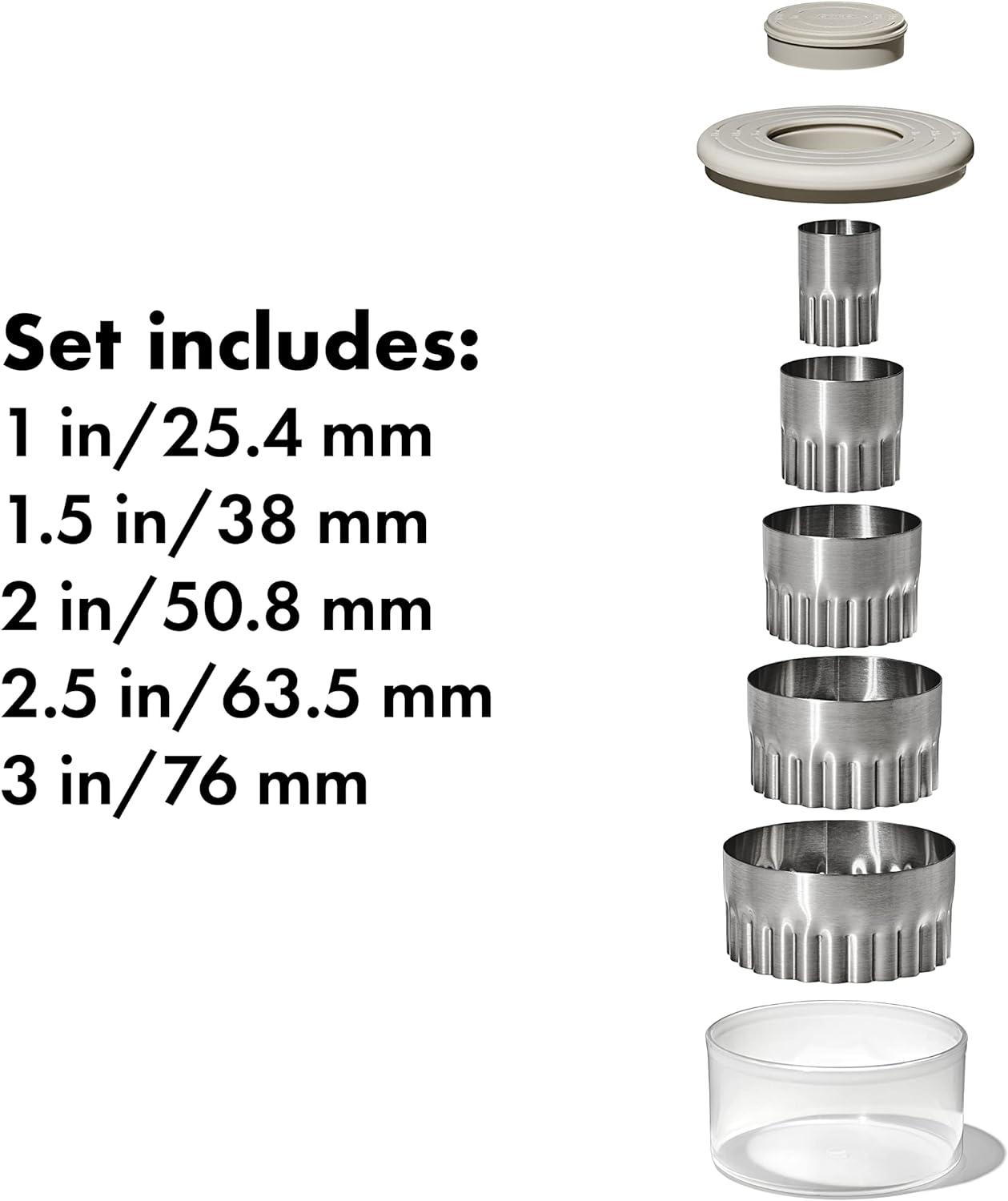 Whether you’re baking cookies, biscuits or scones, the OXO Good Grips Double-Sided Cookie & Biscuit Cutter Set has got the size you need for a uniform batch. Plus they’re reversible—one side is flat and the other is scalloped to give those biscuits, scones or tarts the delicate, fluted edge they deserve. The set of five stainless steel cutters come in 1 in/25.4 mm; 1.5 in/38 mm; 2 in/50.8 mm; 2.5 in/63.5 mm; and 3 in/76 mm sizes. With so many sizes, the possibilities are endless—use them to cook an egg, core an apple or make dumplings. Plus, the set features a soft, non-slip silicone hand guard that’s comfortable and helps prevent hand fatigue while cutting dough. We’ve also included a storage case with lid that makes it simple to store the cutters when not in use. Dishwasher safe.