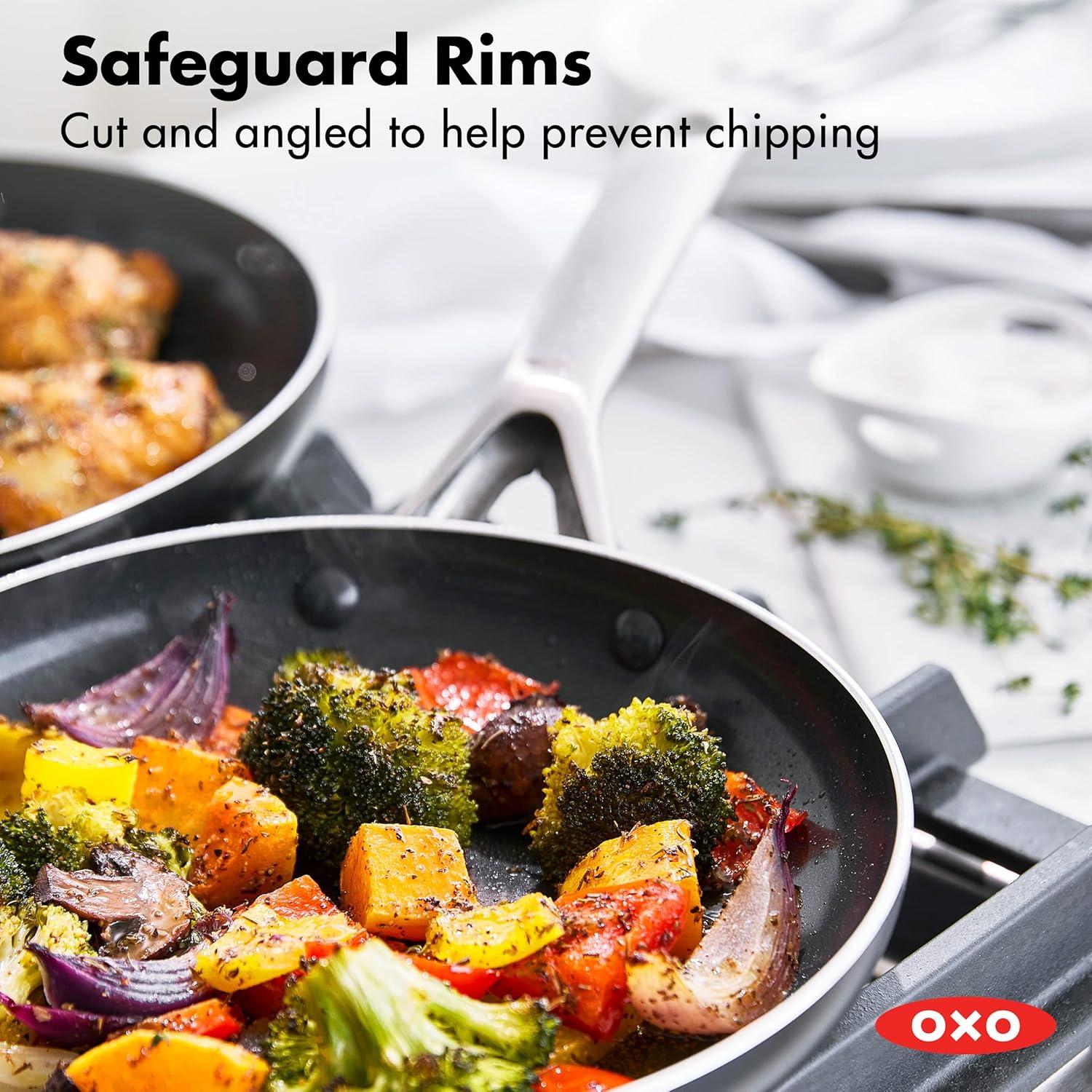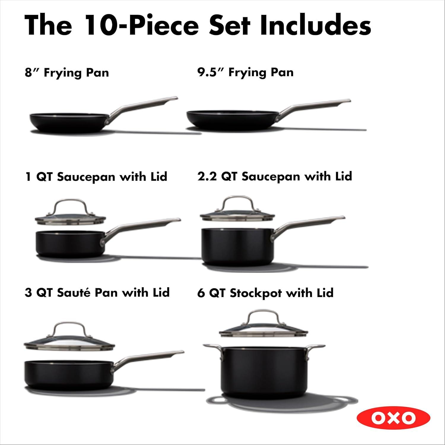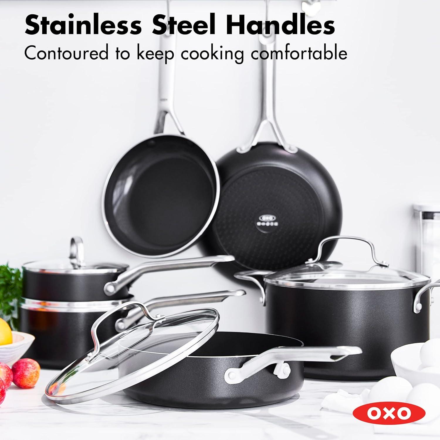OXO Good Grips 10 Piece Cookware Pots and Pans Set, 3-Layered German Engineered Nonstick Coating, Stainless Steel Handle with Nonslip Silicone, Gray(10 Piece Cookware Set with Grips)