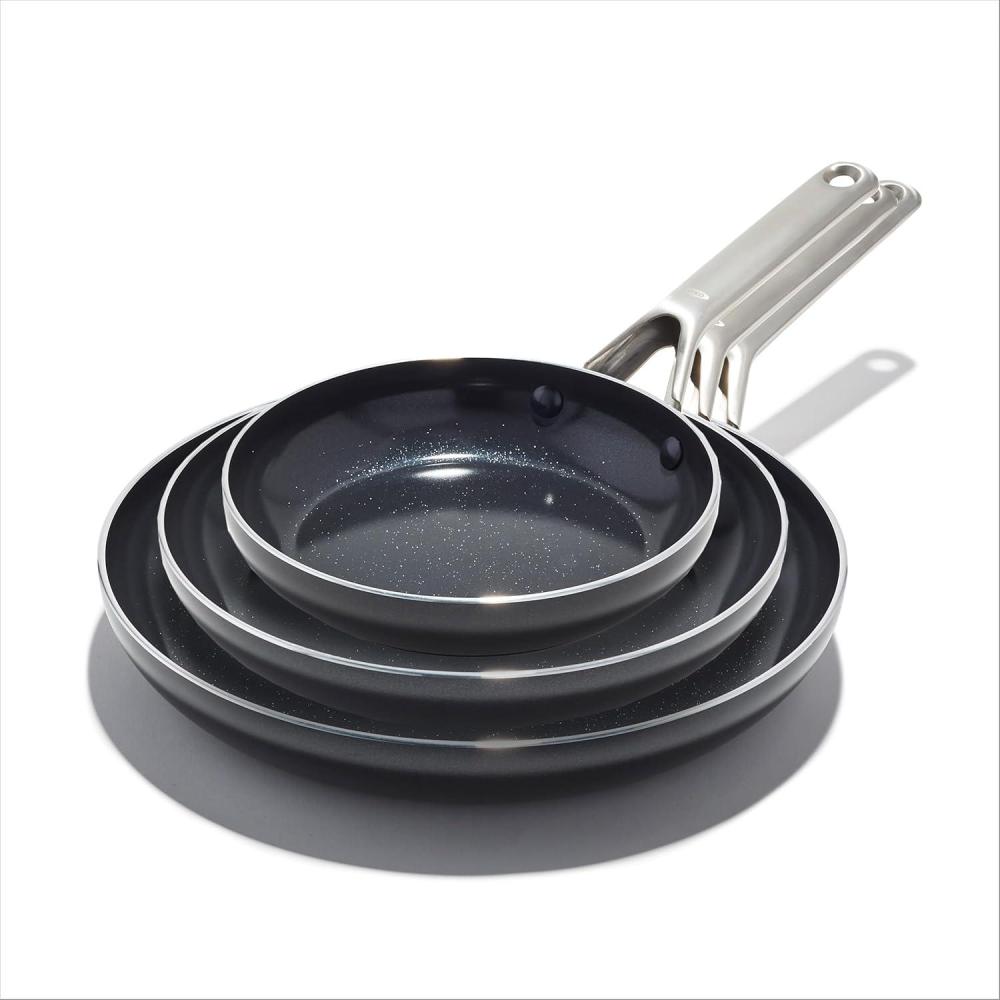 There’s a reason the OXO Good Grips Non-Stick Frying Pan was named America’s Test Kitchen’s highest rated 12-in non-stick skillet. Our pan is engineered with a three-layer, German-engineered non-stick coating that provides effortless performance while using less oil and delivers quick and easy cleanup. The pan’s scratch-resistant, hard-anodized body heats faster and more evenly than traditional aluminum, and the silicone-wrapped stainless steel handle helps keep cooking comfortable. Hand wash. Oven safe up to 390°F/200°C. 10-year limited warranty.