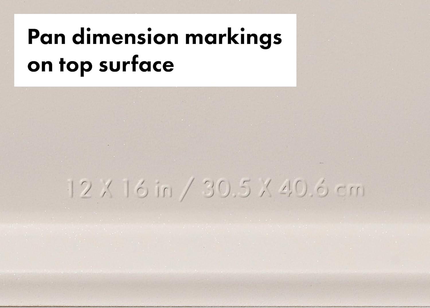 The OXO Non-Stick Pro Ceramic Coated Metal Bakeware Cookie Sheet is a bakeware solution that’s beautiful, durable and easy to clean. The cookie sheet provides versatility for baking and roasting – it’s ideal for baking a dozen cookies or a tray of fries. The efficient ceramic non-stick coating heats quickly and evenly, allows for easy food release and protects against scratching, staining, corrosion and abrasion. Get consistent results – the light interior coating color has been optimized for even browning for both sweet and savory baking. The bakeware is constructed from heavy-gauge aluminized steel for stability, even heat distribution and durability for years to come. The square-rolled edge adds structure and strength to the bakeware, and the wide rims provide a secure grip for easier handling in and around the oven. Each pan features pan dimension markings on the top surface, so you can find the right bakeware item for your recipe. Zero-draft walls on our cake pans allow for straight and uniform cake layers. Rounded interior corners allow for easier cleaning. Non-stick ceramic coating made without PFAS. Hand wash for best results. Cookie Sheet dimensions: External:14.26 in x 17.85 in • 36.23 cm x 45.34 cm | Internal: 12.98 in x 17.11 in • 32.98 cm x 43.45 cm.