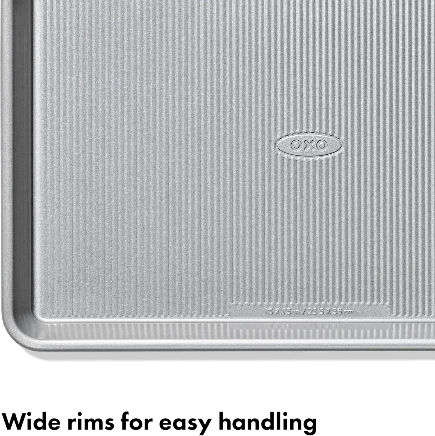 OXO Non-Stick Pro Clear Coated Metal Bakeware Half Sheet Pan is your baking sheet that is a heavy hitter in the kitchen. Use this baking pan everyday — the half sheet pan fits most home ovens. Made from heavy gauge aluminized steel, these baking sheets provide proper heat conduction for even baking, browning and crisping. The micro texture pattern supports airflow and eliminates both hot spots and undercooked centers. If you’re familiar with baking supplies then you know the value of a smooth surface. The sheet pan is glazed with a non-stick silicone coating for easy food release, quick cleanup and everyday use with long lasting scratch-free potential.