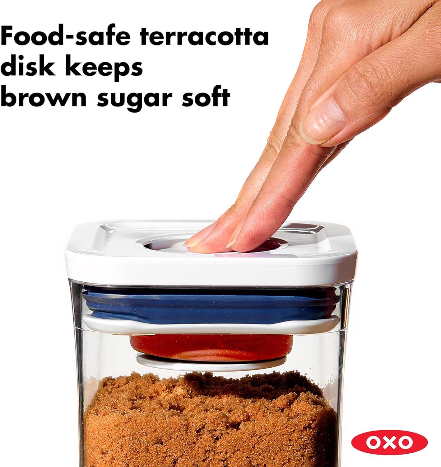 The OXO POP Brown Sugar Saver is a food-safe terracotta disk that keeps brown sugar soft and fresh