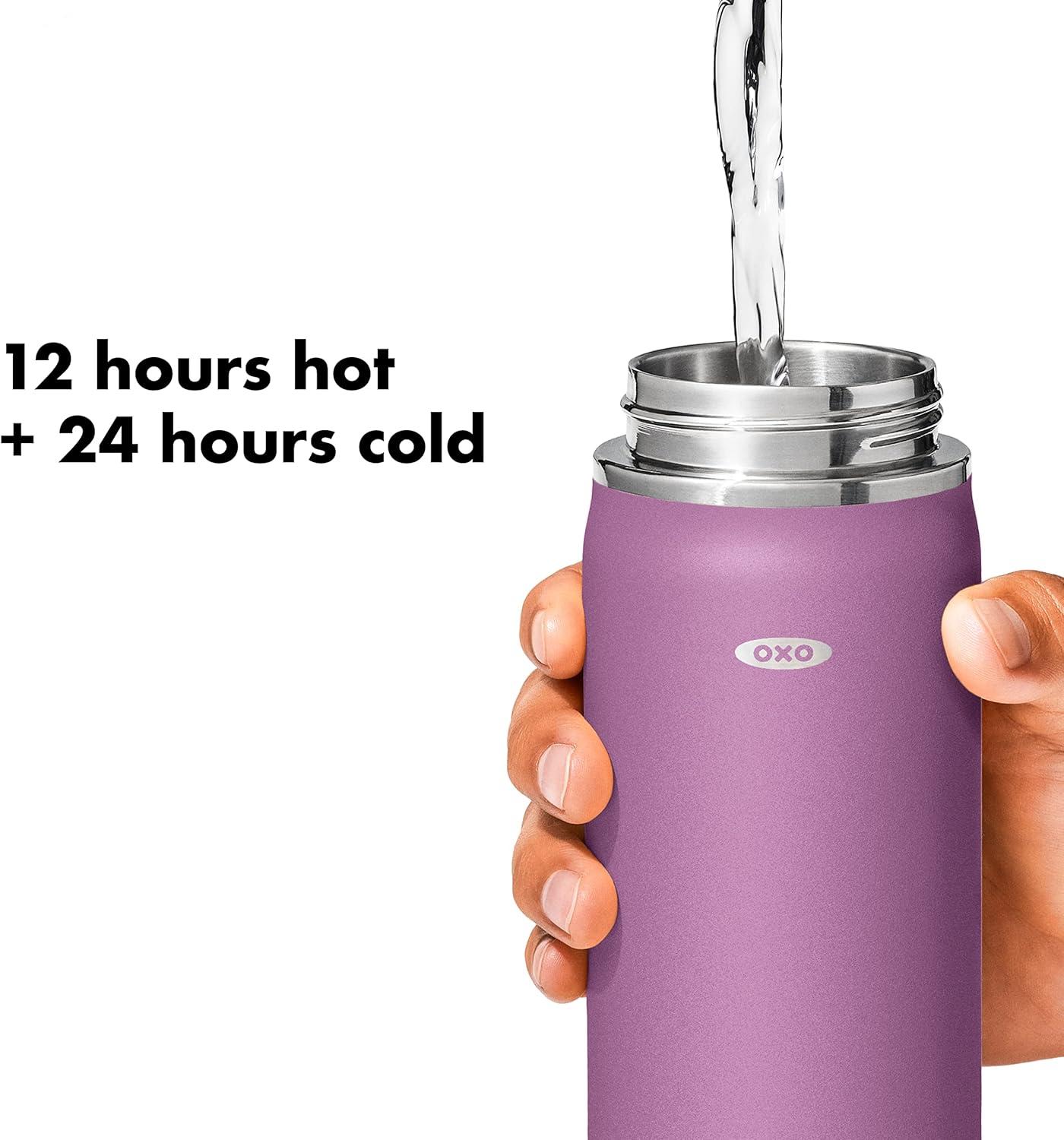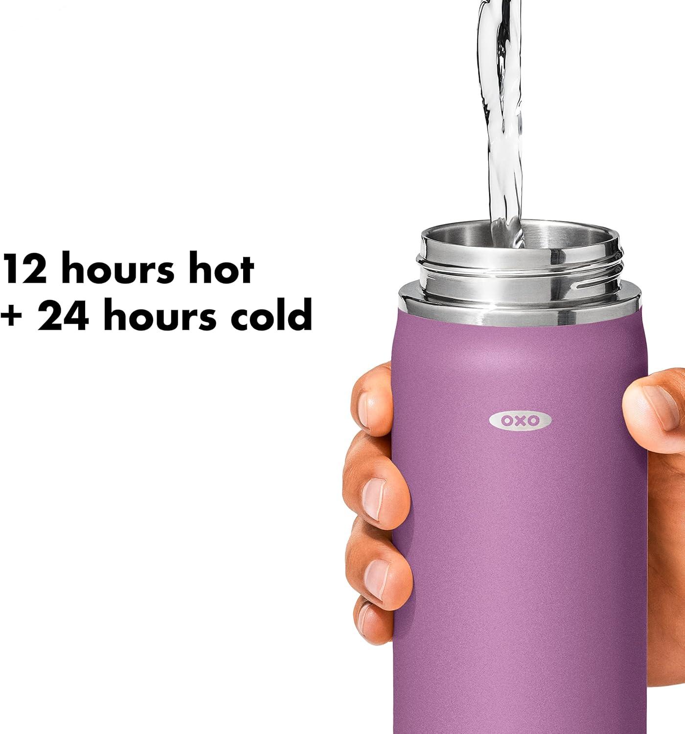 Sip with confidence knowing your drink will still be cold (or hot!) with the OXO Strive 24 oz/710 mL Insulated Wide Mouth Water Bottle with Straw Lid The Insulated Water Bottle is sized to fit most car cup holders and features a non-slip, sweatproof coating for a comfortable grip. The easy-to-clean lid features a removable silicone gasket, and the straw flips open for quick access and snaps closed to help prevent spills. Stainless steel, double-wall vacuum insulation keeps drinks cold for 24 hours or hot for 12 hours. The bottle and lid are dishwasher safe. BPA free.