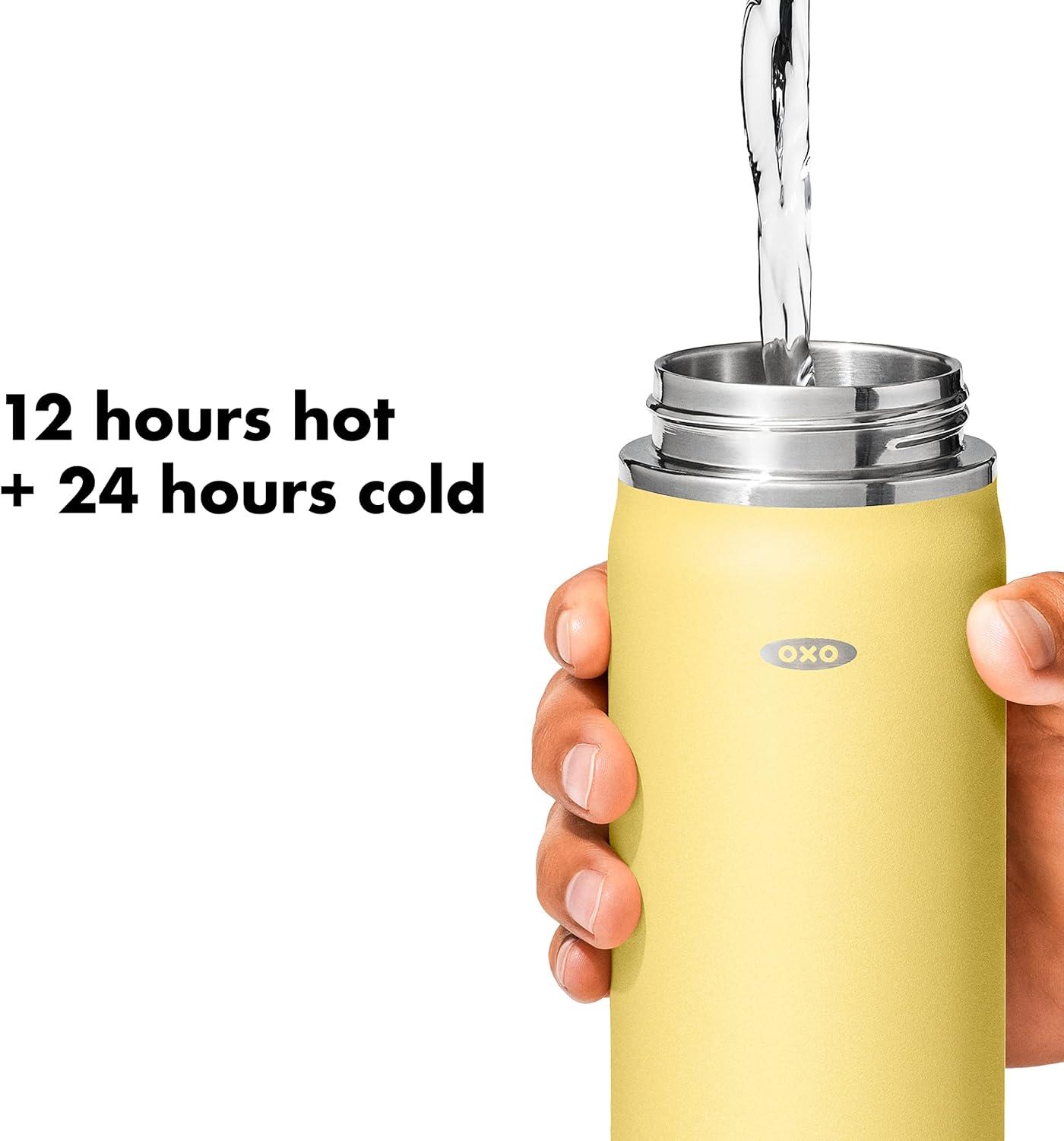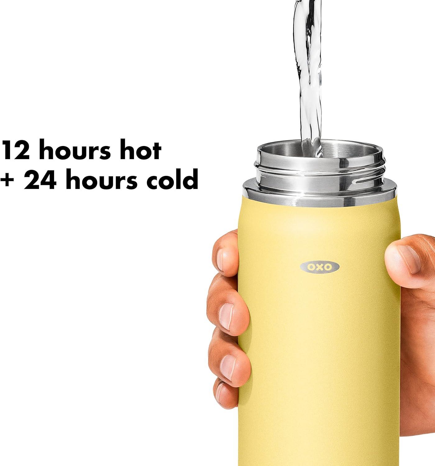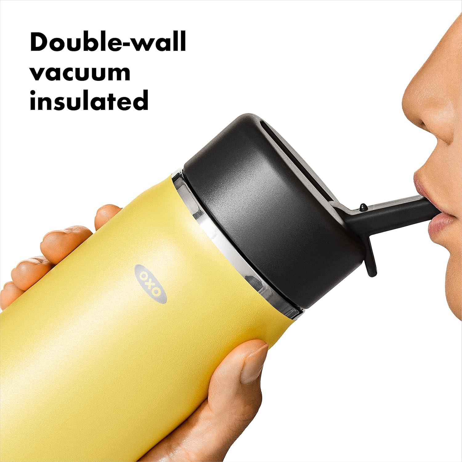 Sip with confidence knowing your drink will still be cold (or hot!) with the OXO Strive 24 oz/710 mL Insulated Wide Mouth Water Bottle with Straw Lid The Insulated Water Bottle is sized to fit most car cup holders and features a non-slip, sweatproof coating for a comfortable grip. The easy-to-clean lid features a removable silicone gasket, and the straw flips open for quick access and snaps closed to help prevent spills. Stainless steel, double-wall vacuum insulation keeps drinks cold for 24 hours or hot for 12 hours. The bottle and lid are dishwasher safe. BPA free.