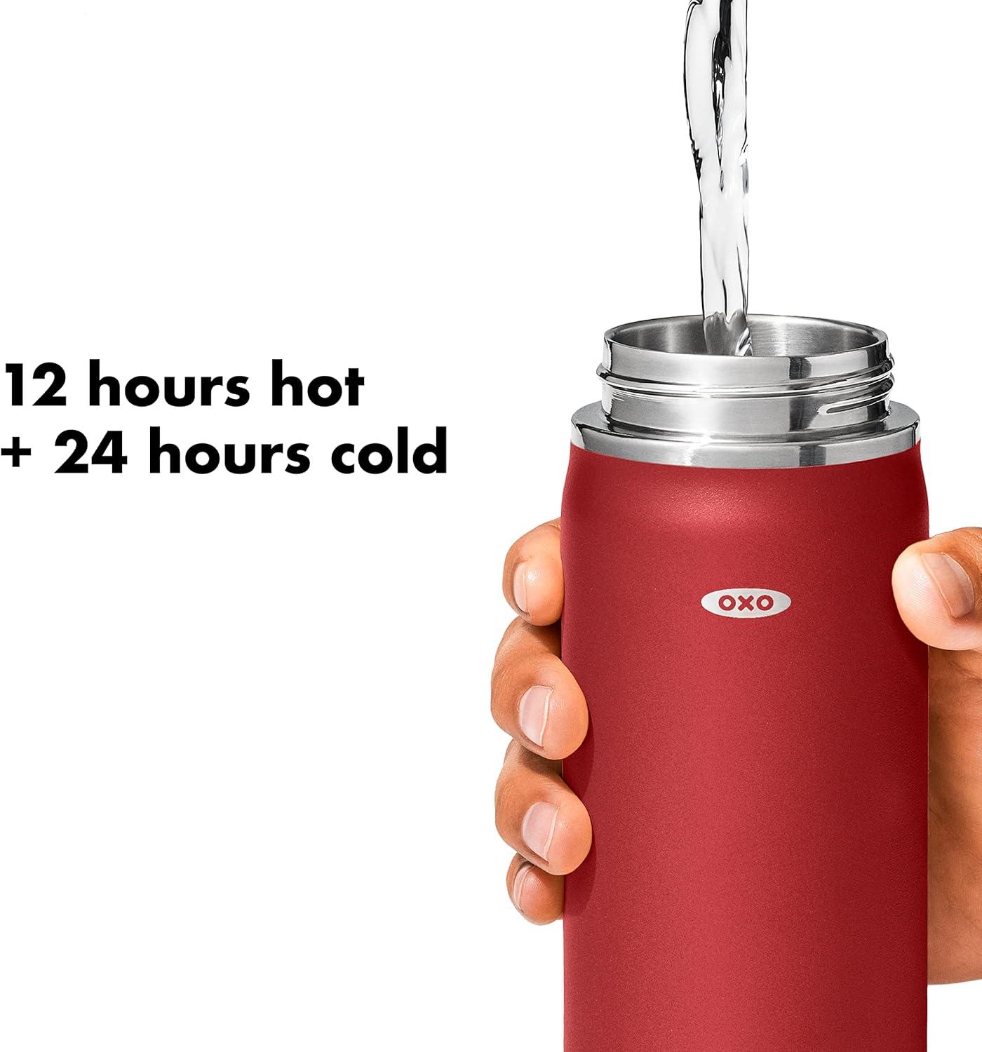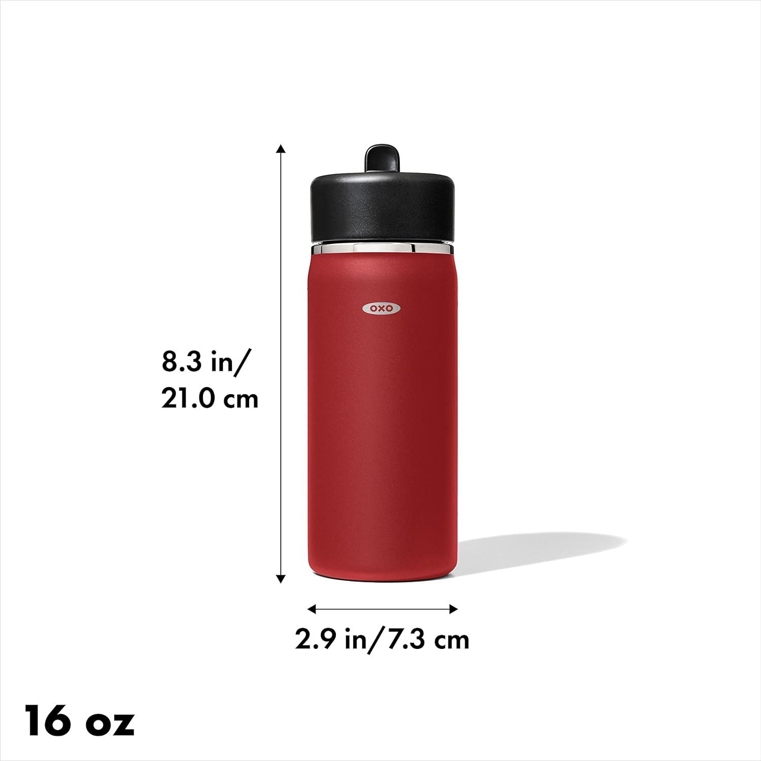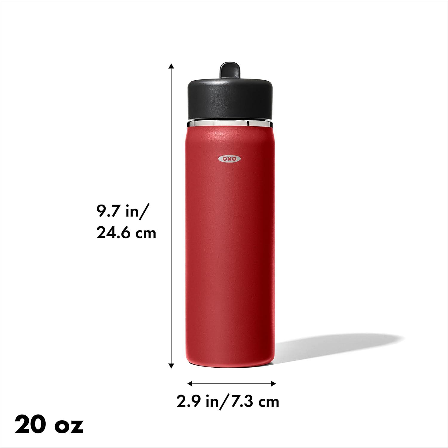 Sip with confidence knowing your drink will still be cold (or hot!) with the OXO Strive 24 oz/710 mL Insulated Wide Mouth Water Bottle with Straw Lid The Insulated Water Bottle is sized to fit most car cup holders and features a non-slip, sweatproof coating for a comfortable grip. The easy-to-clean lid features a removable silicone gasket, and the straw flips open for quick access and snaps closed to help prevent spills. Stainless steel, double-wall vacuum insulation keeps drinks cold for 24 hours or hot for 12 hours. The bottle and lid are dishwasher safe. BPA free.