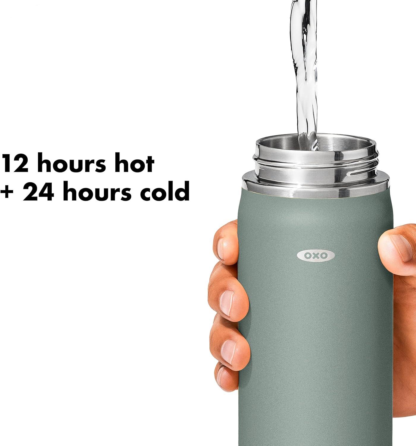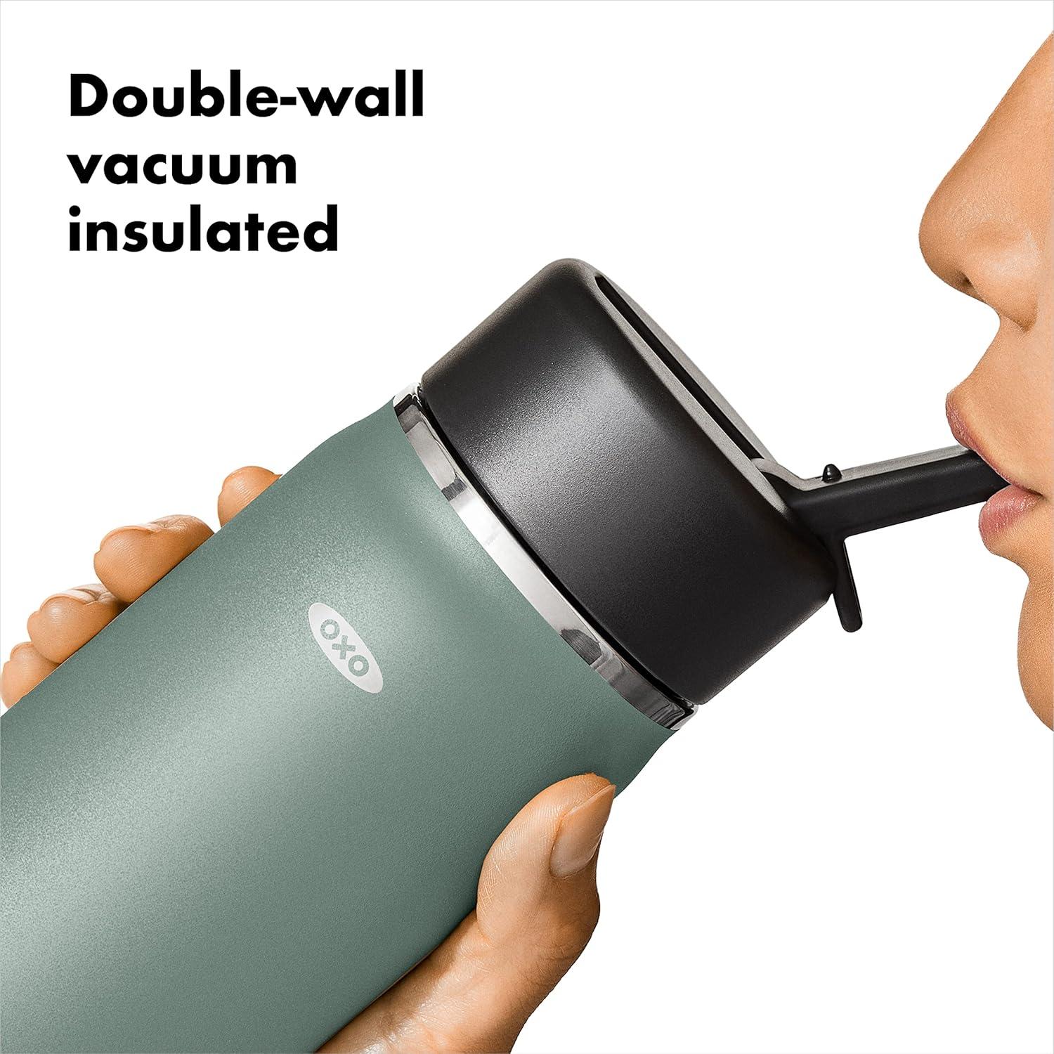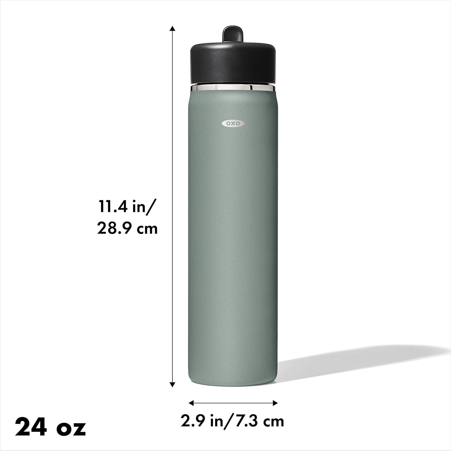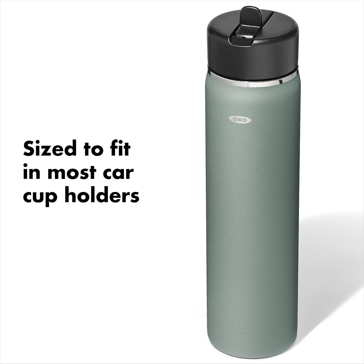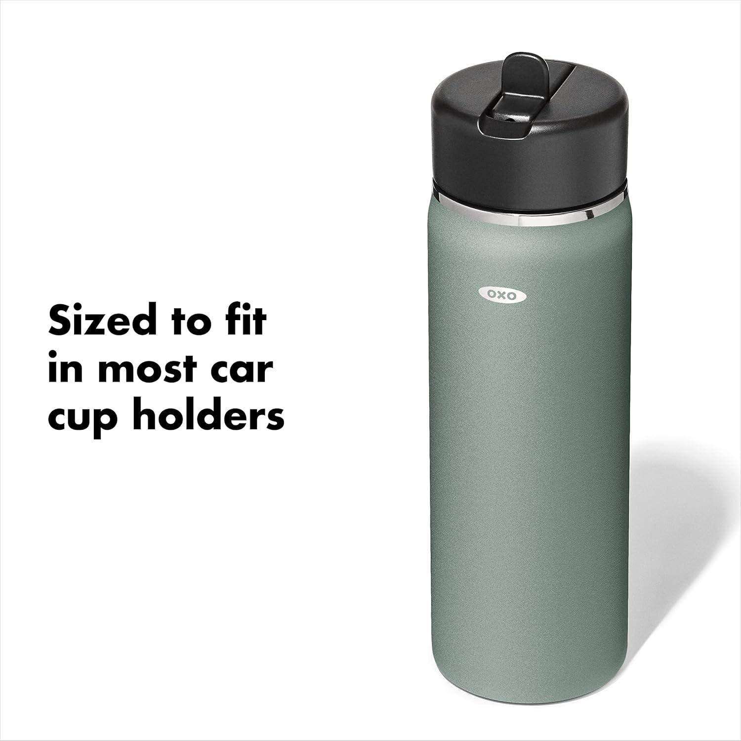 Sip with confidence knowing your drink will still be cold (or hot!) with the OXO Strive 24 oz/710 mL Insulated Wide Mouth Water Bottle with Straw Lid The Insulated Water Bottle is sized to fit most car cup holders and features a non-slip, sweatproof coating for a comfortable grip. The easy-to-clean lid features a removable silicone gasket, and the straw flips open for quick access and snaps closed to help prevent spills. Stainless steel, double-wall vacuum insulation keeps drinks cold for 24 hours or hot for 12 hours. The bottle and lid are dishwasher safe. BPA free.
