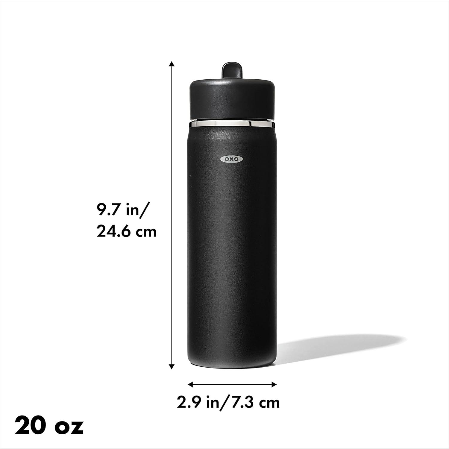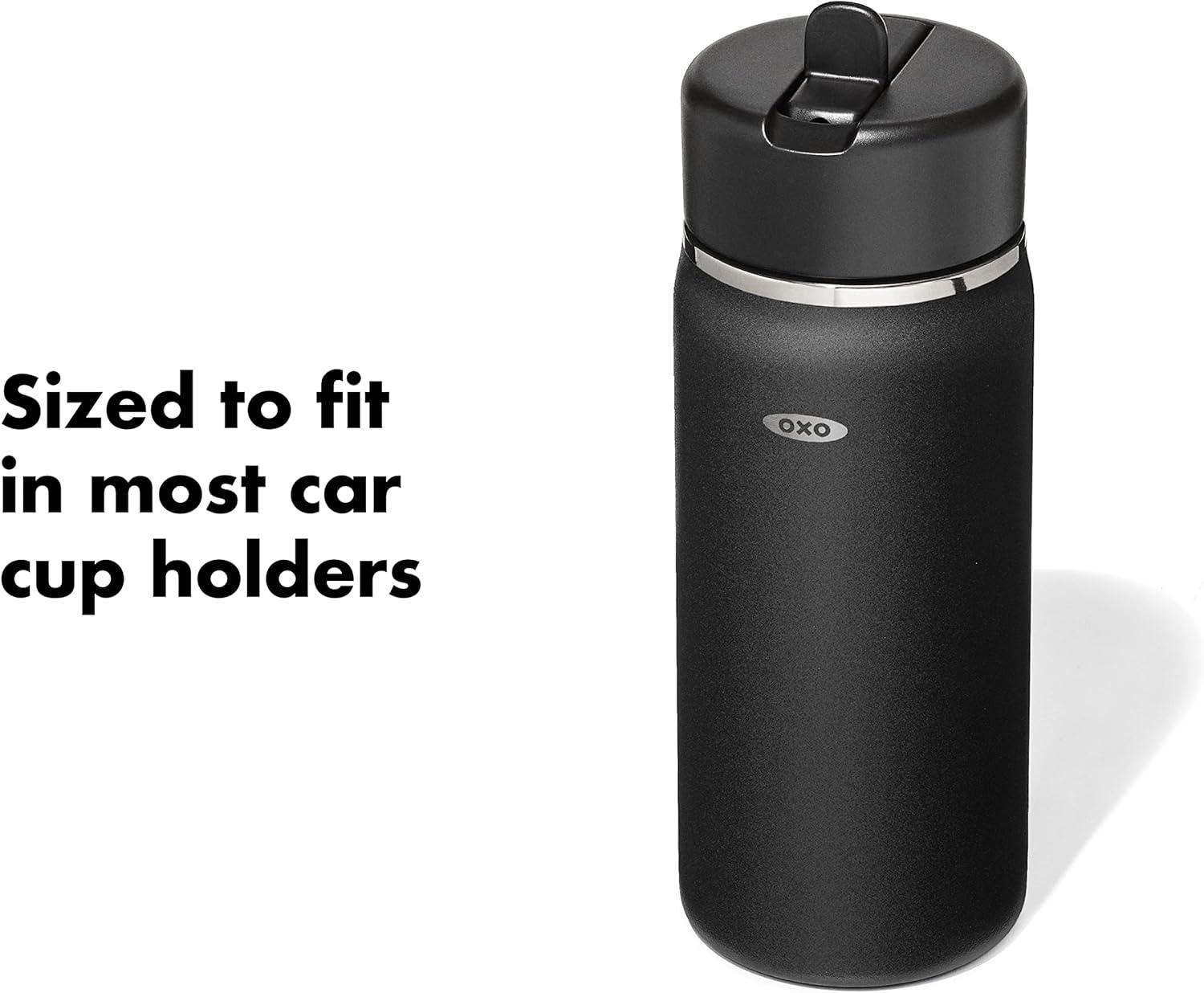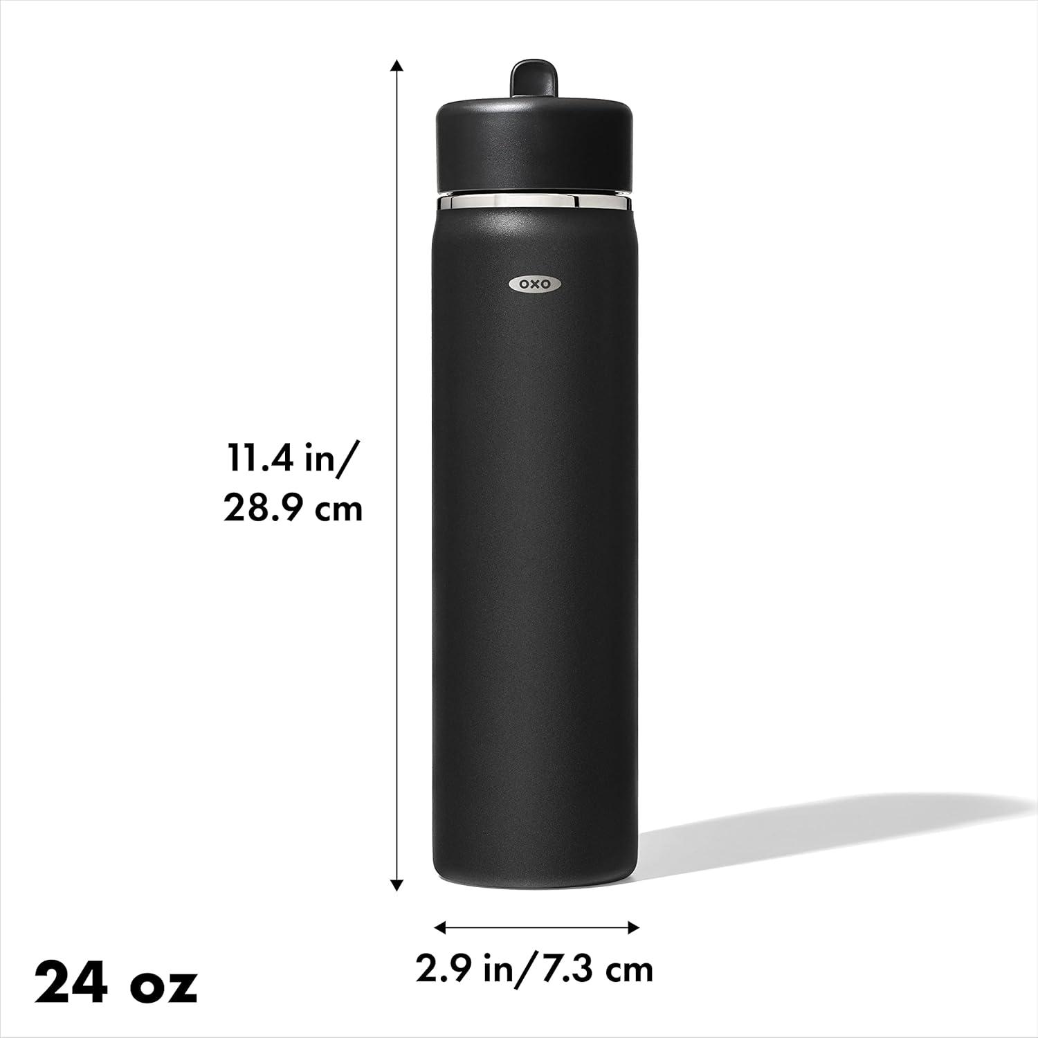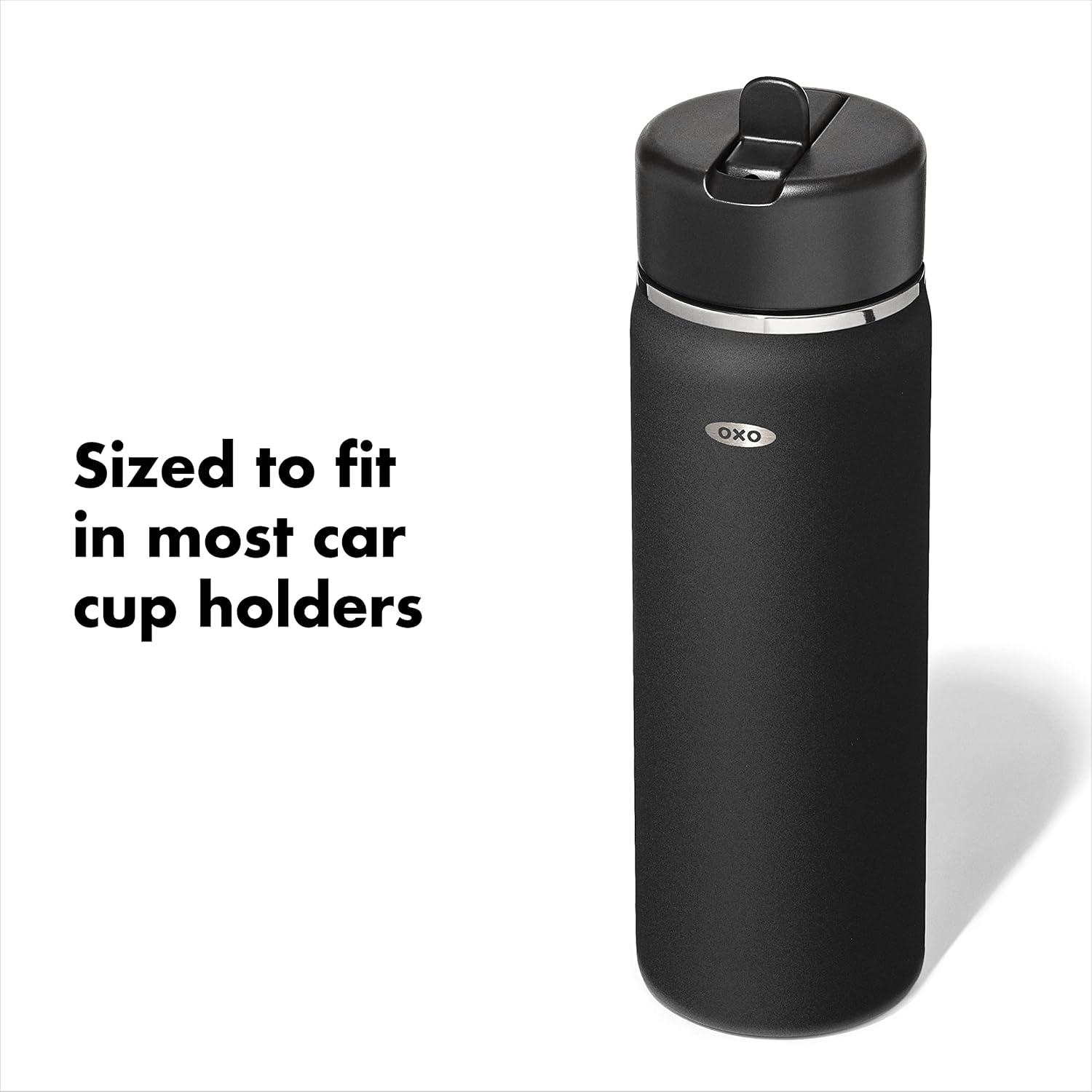 Sip with confidence knowing your drink will still be cold (or hot!) with the OXO Strive 24 oz/710 mL Insulated Wide Mouth Water Bottle with Straw Lid The Insulated Water Bottle is sized to fit most car cup holders and features a non-slip, sweatproof coating for a comfortable grip. The easy-to-clean lid features a removable silicone gasket, and the straw flips open for quick access and snaps closed to help prevent spills. Stainless steel, double-wall vacuum insulation keeps drinks cold for 24 hours or hot for 12 hours. The bottle and lid are dishwasher safe. BPA free.