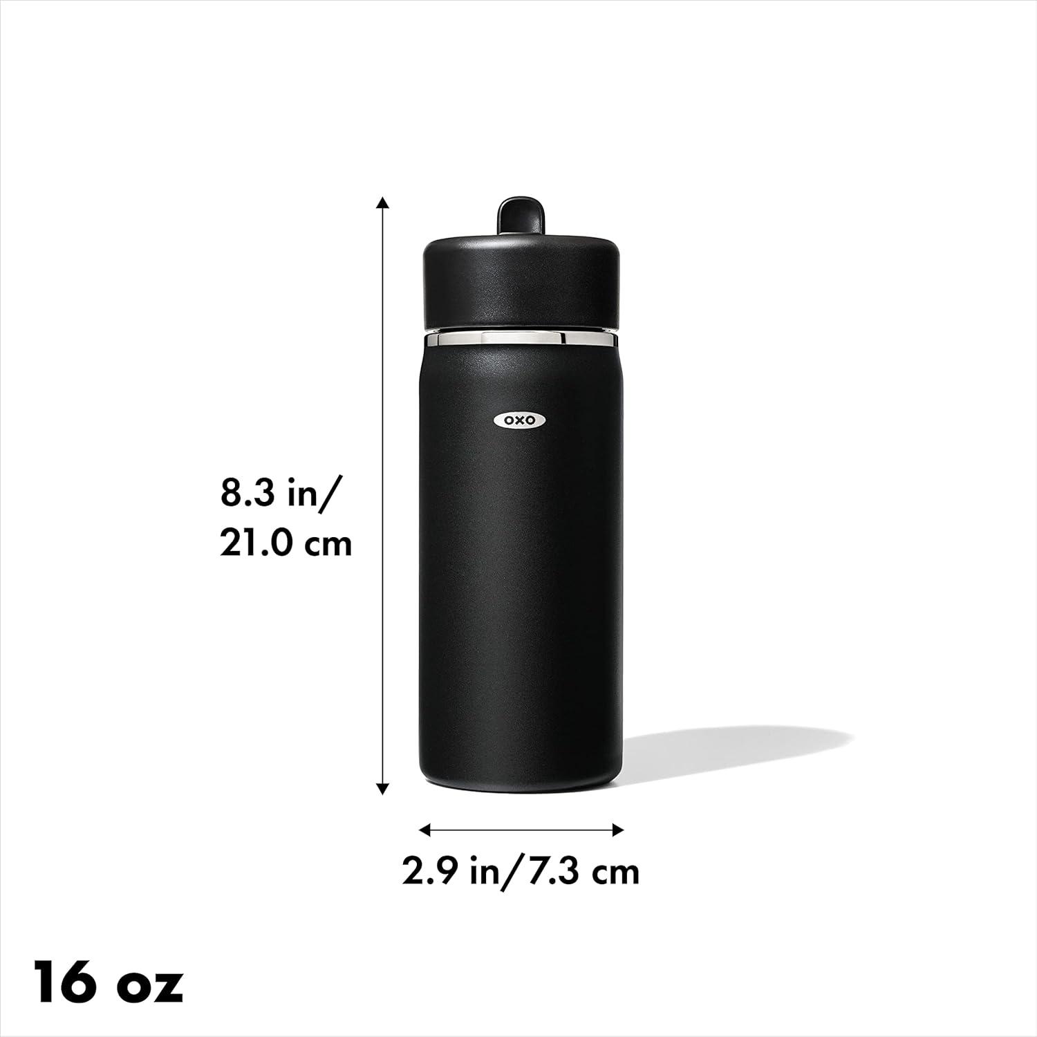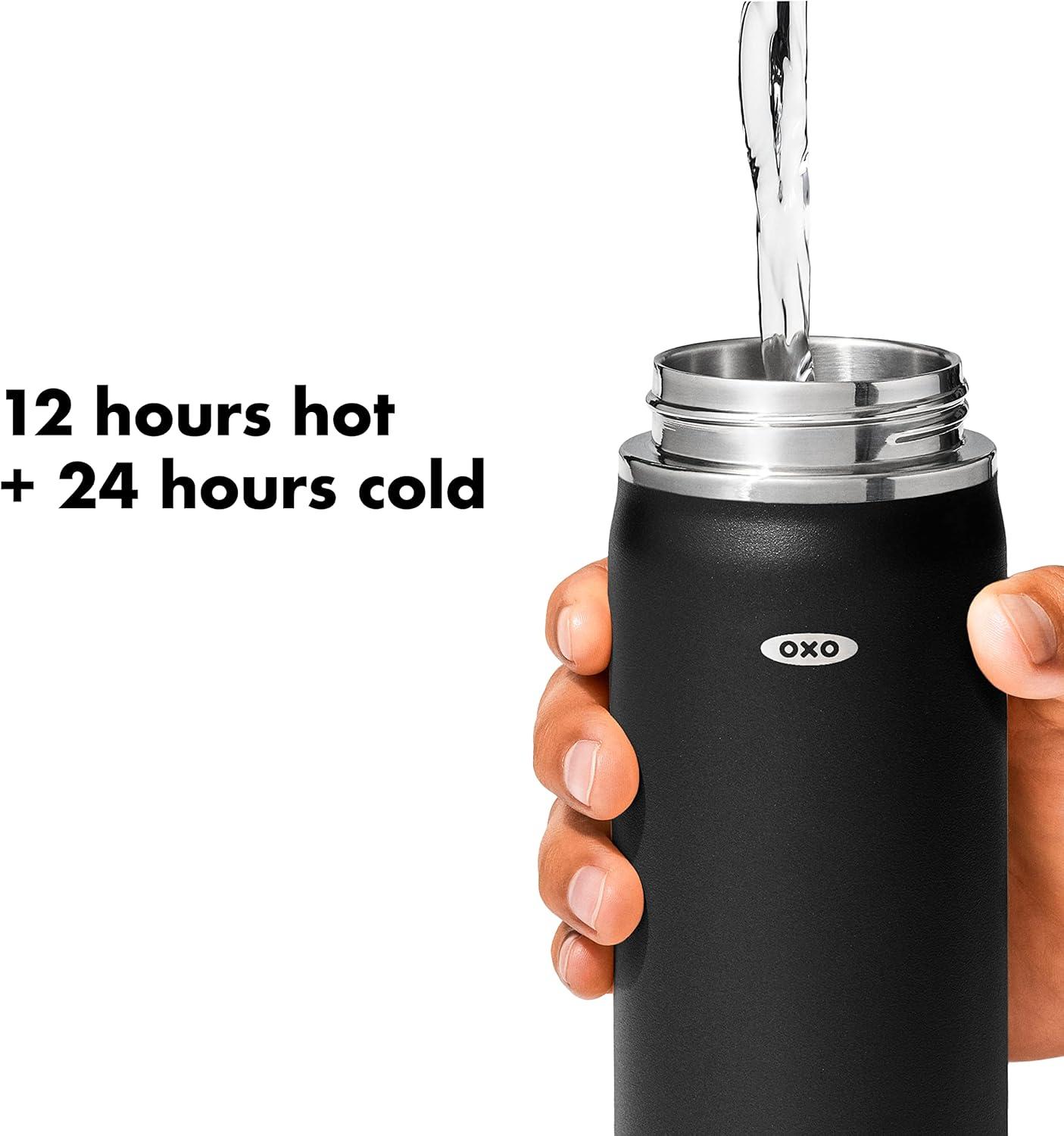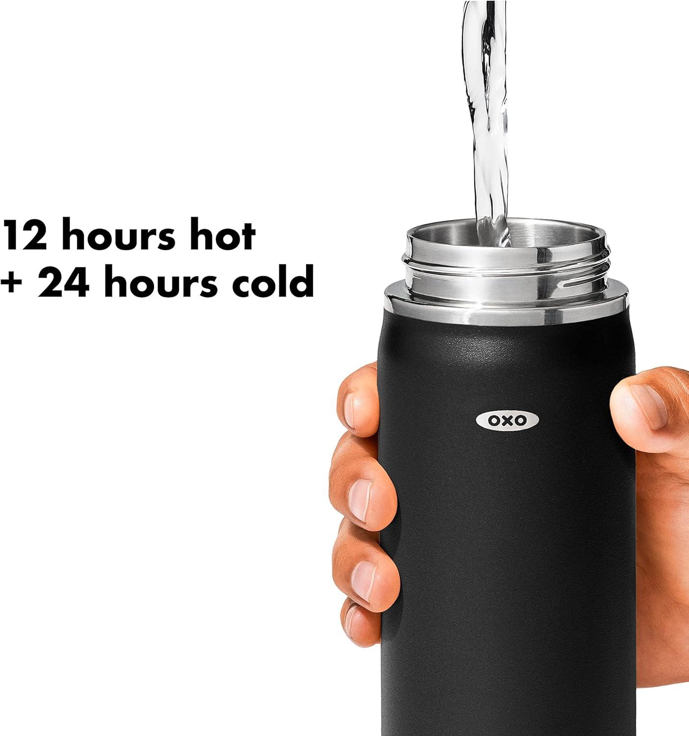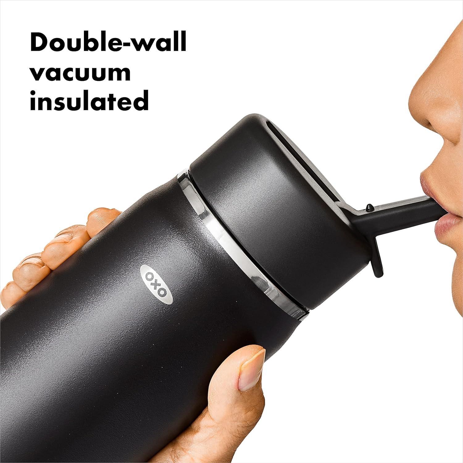 Sip with confidence knowing your drink will still be cold (or hot!) with the OXO Strive 24 oz/710 mL Insulated Wide Mouth Water Bottle with Straw Lid The Insulated Water Bottle is sized to fit most car cup holders and features a non-slip, sweatproof coating for a comfortable grip. The easy-to-clean lid features a removable silicone gasket, and the straw flips open for quick access and snaps closed to help prevent spills. Stainless steel, double-wall vacuum insulation keeps drinks cold for 24 hours or hot for 12 hours. The bottle and lid are dishwasher safe. BPA free.