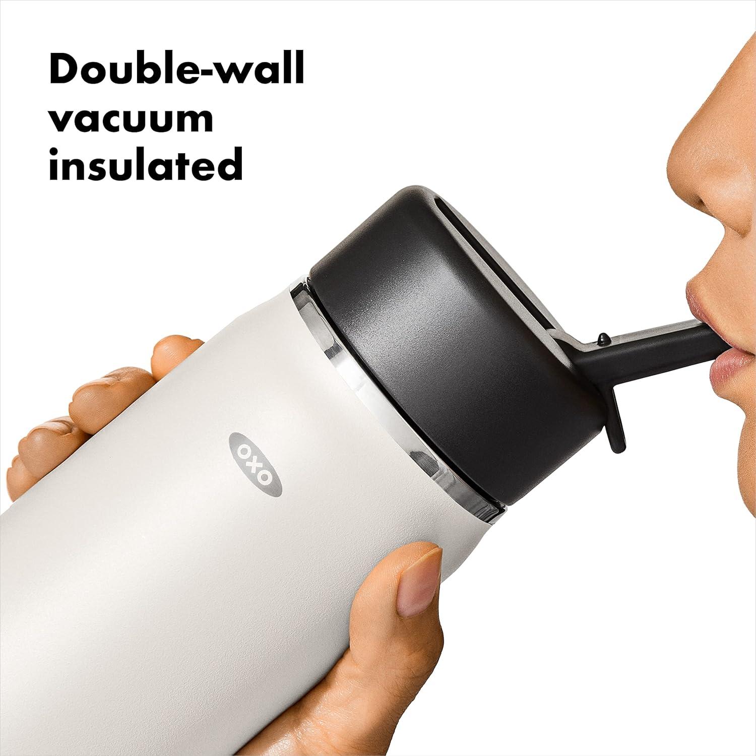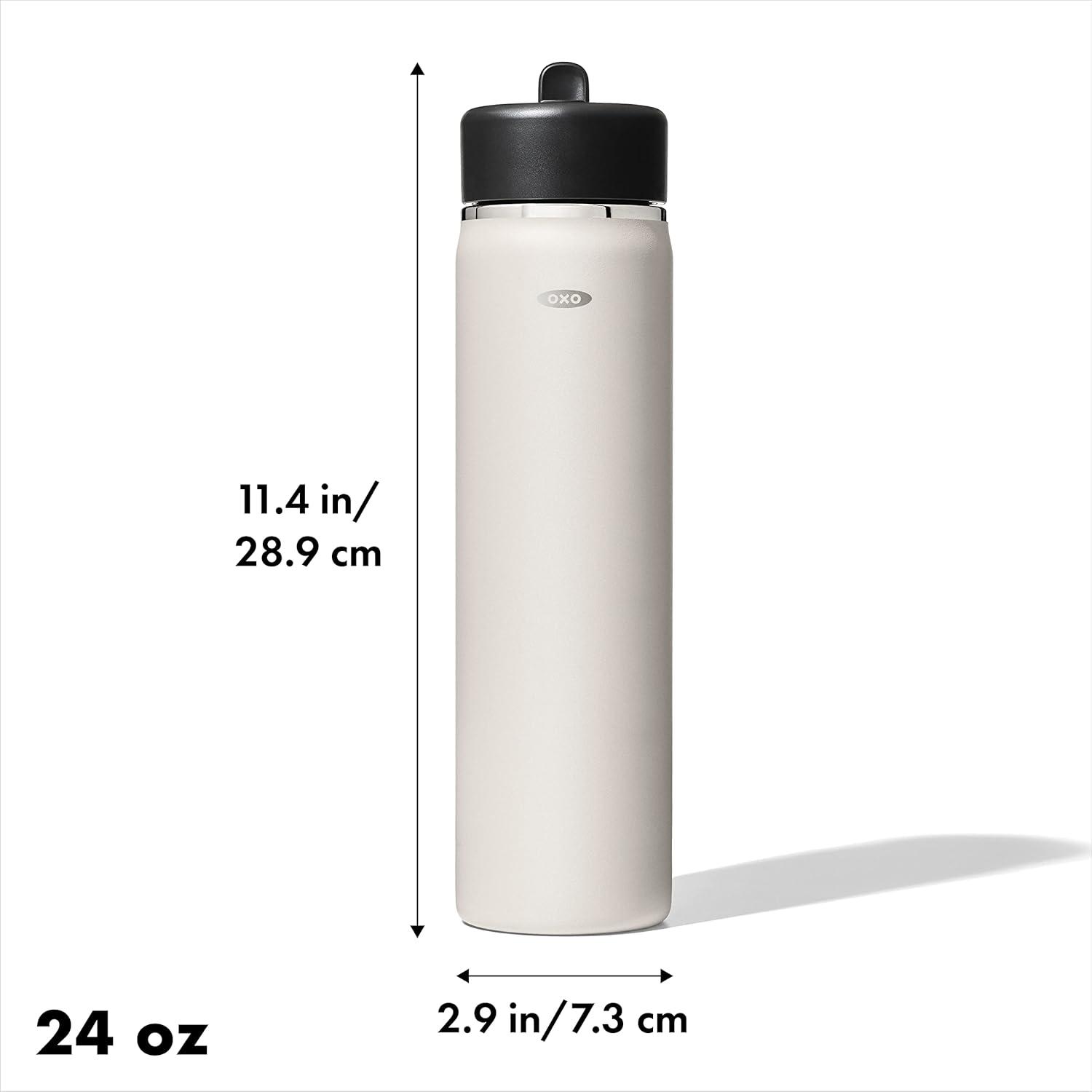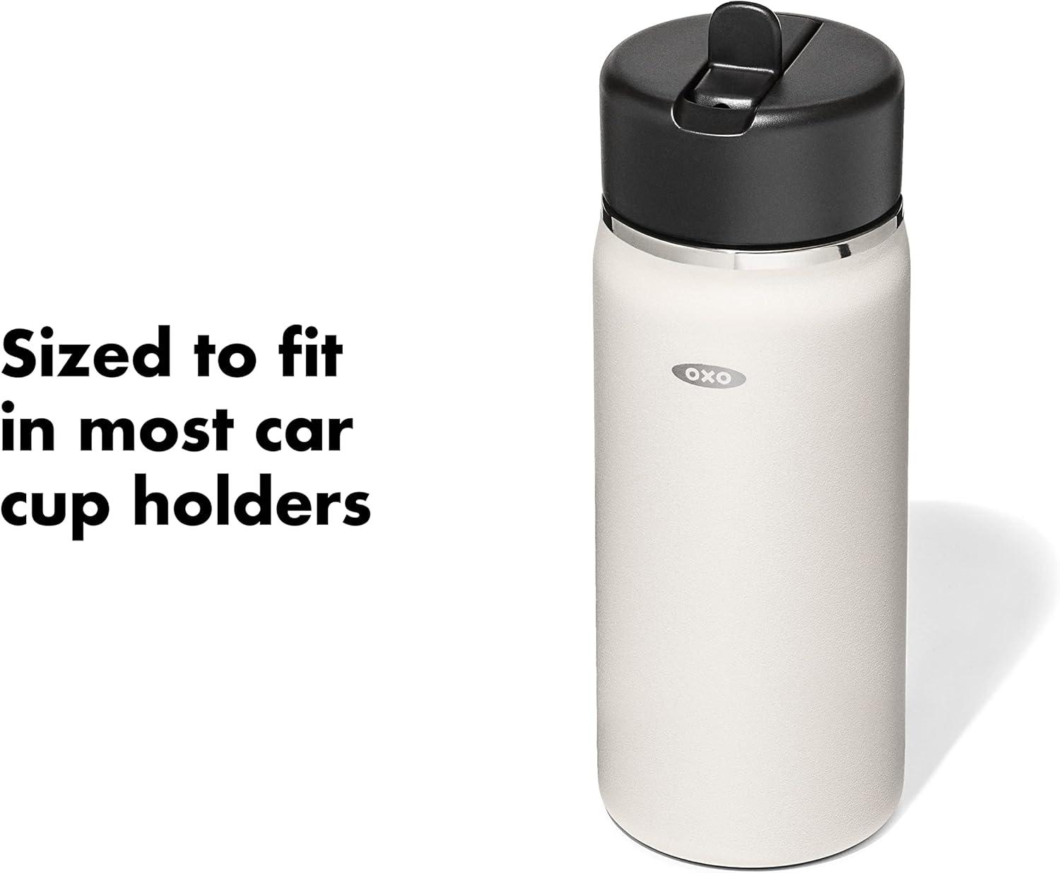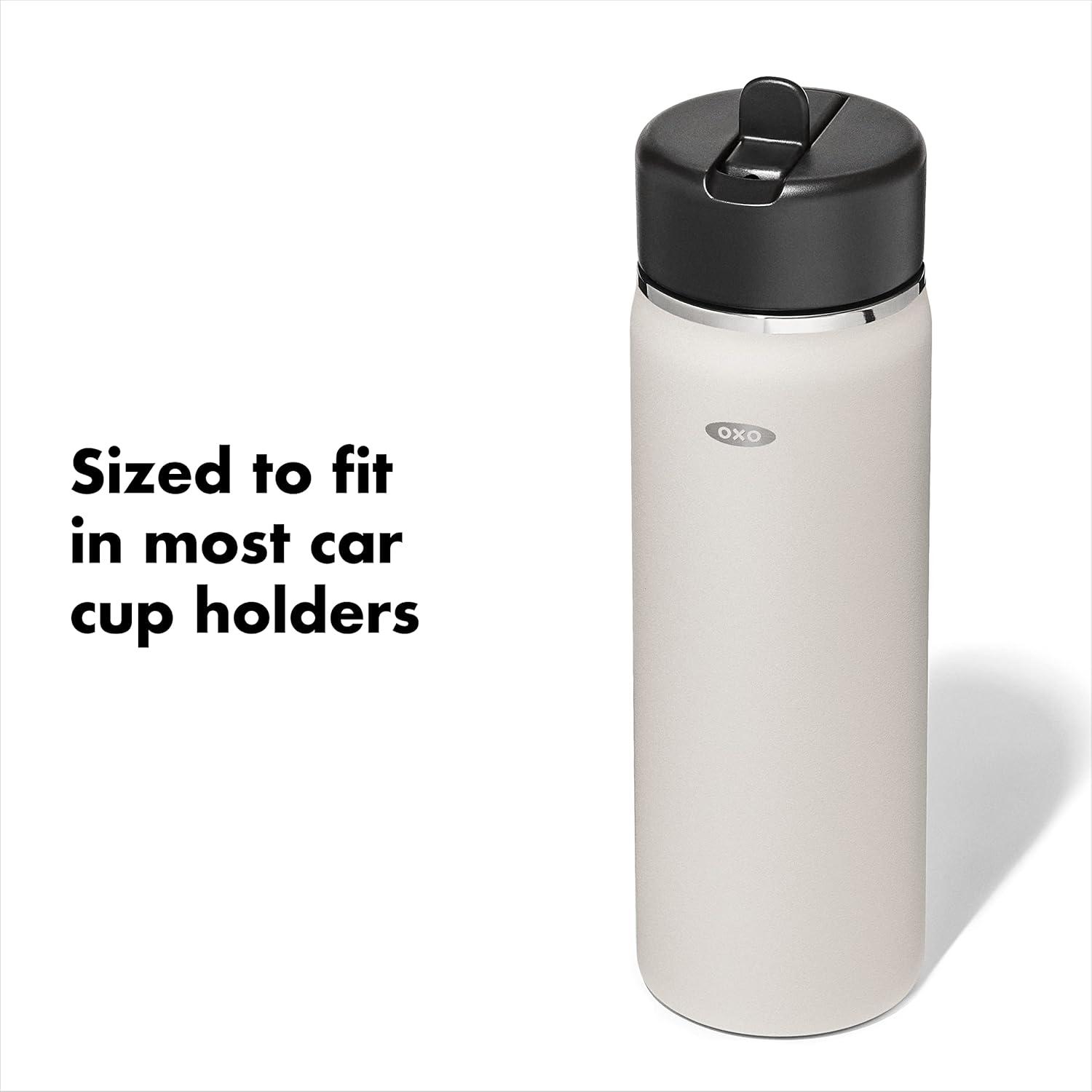 Sip with confidence knowing your drink will still be cold (or hot!) with the OXO Strive 24 oz/710 mL Insulated Wide Mouth Water Bottle with Straw Lid The Insulated Water Bottle is sized to fit most car cup holders and features a non-slip, sweatproof coating for a comfortable grip. The easy-to-clean lid features a removable silicone gasket, and the straw flips open for quick access and snaps closed to help prevent spills. Stainless steel, double-wall vacuum insulation keeps drinks cold for 24 hours or hot for 12 hours. The bottle and lid are dishwasher safe. BPA free.