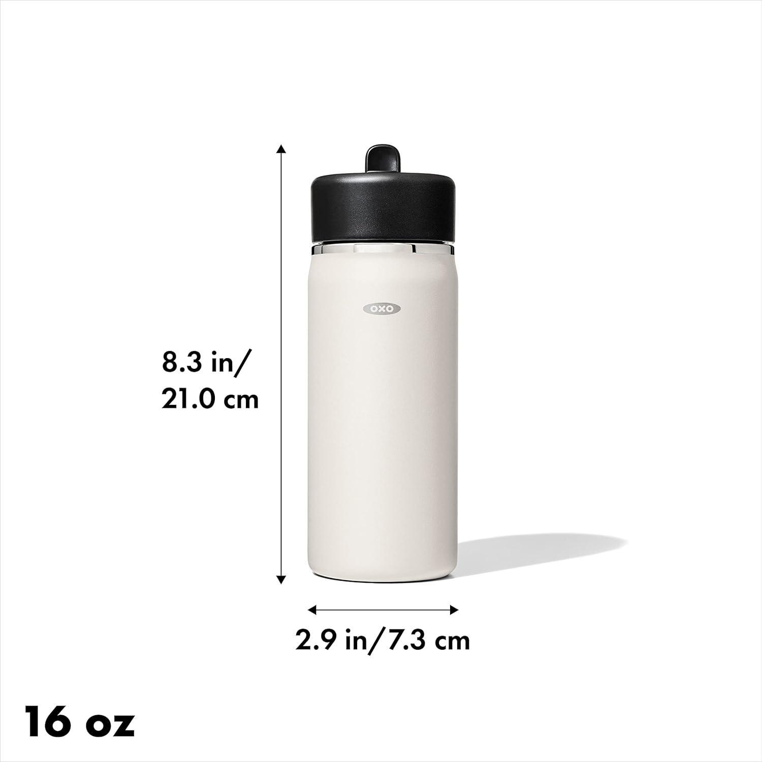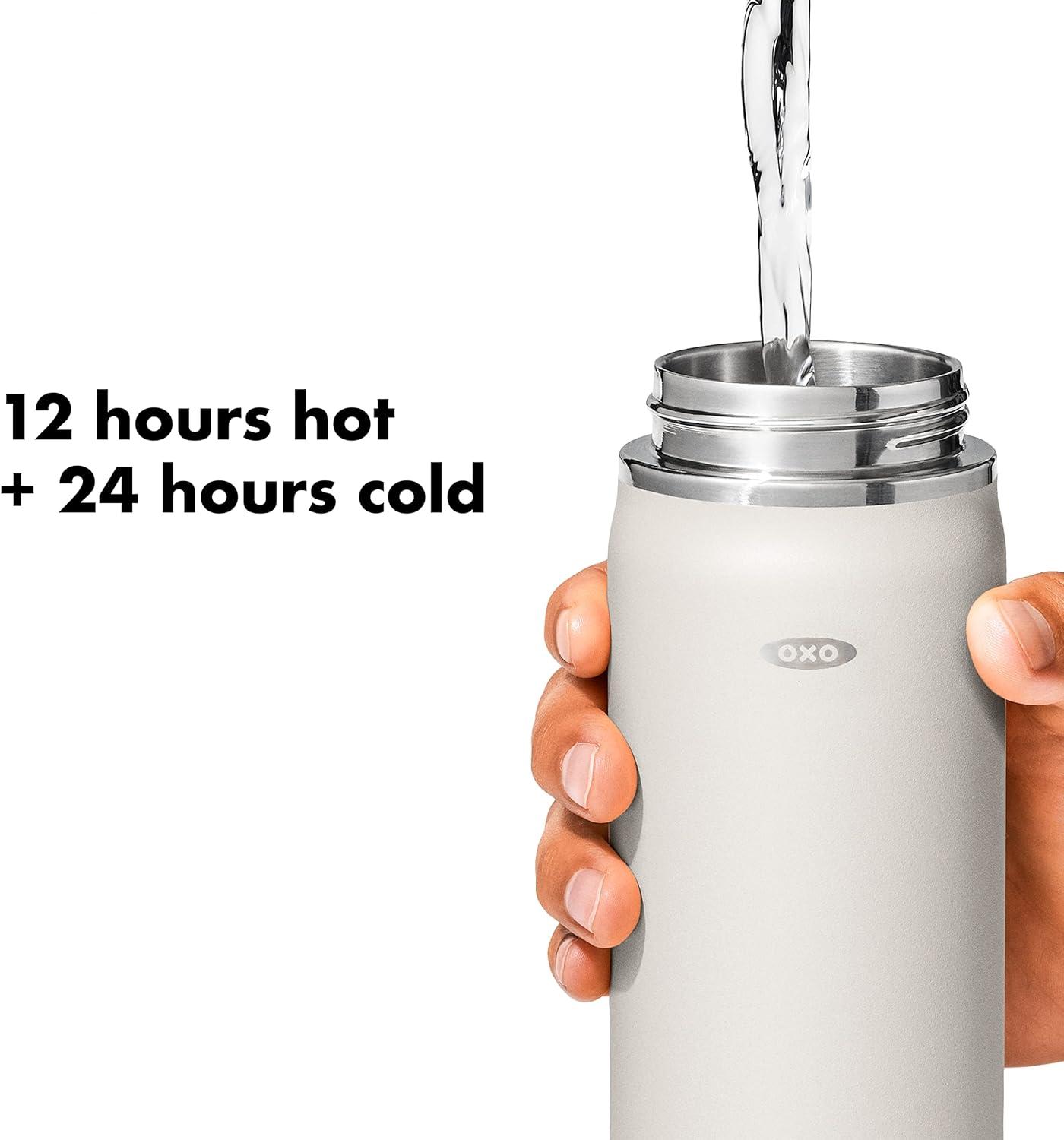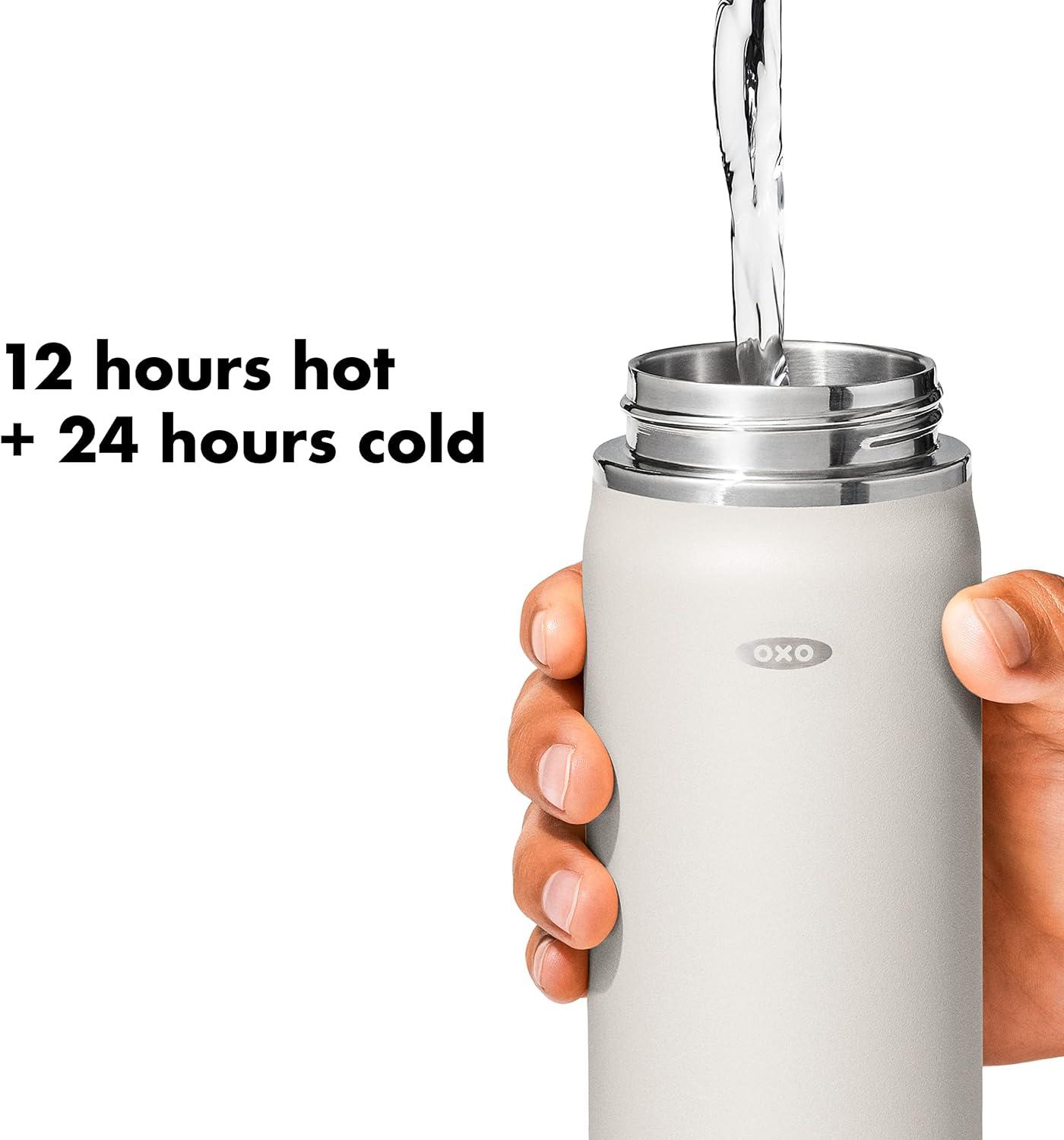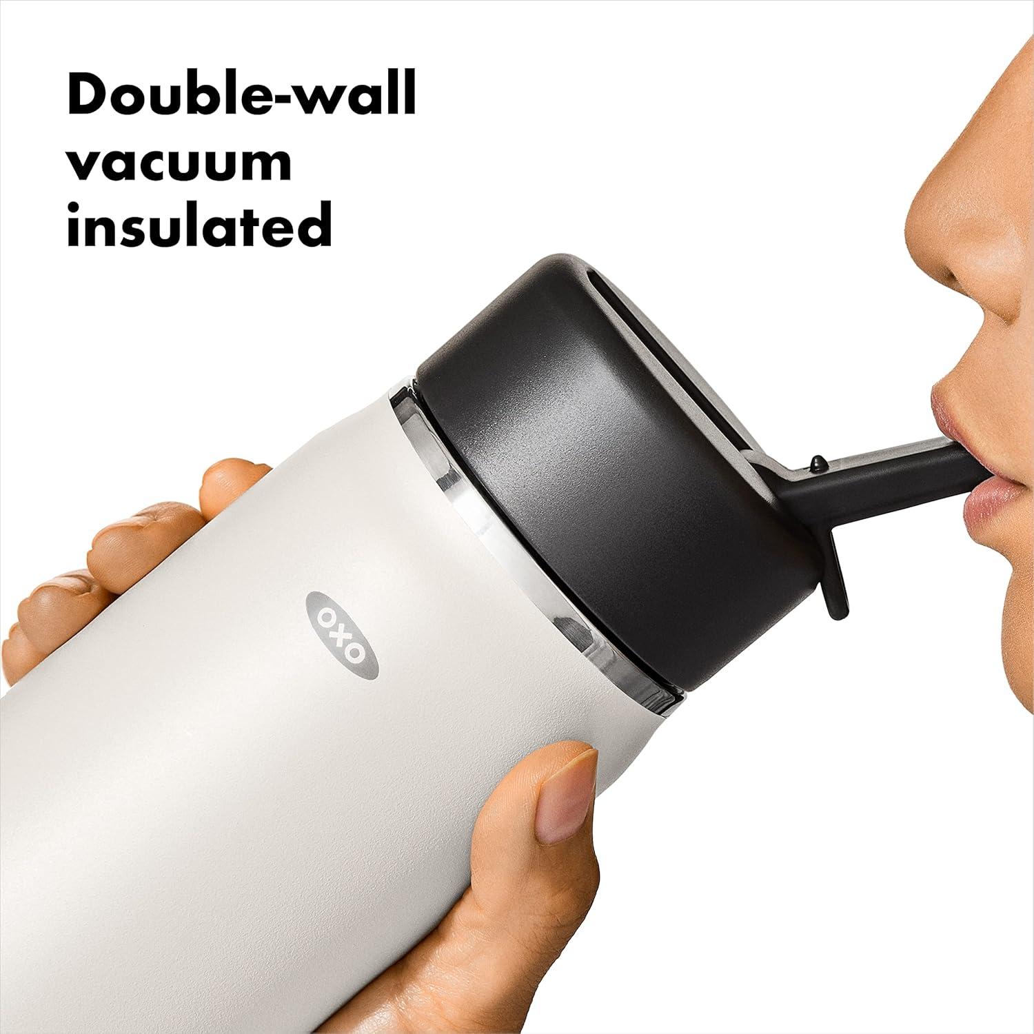 Sip with confidence knowing your drink will still be cold (or hot!) with the OXO Strive 24 oz/710 mL Insulated Wide Mouth Water Bottle with Straw Lid The Insulated Water Bottle is sized to fit most car cup holders and features a non-slip, sweatproof coating for a comfortable grip. The easy-to-clean lid features a removable silicone gasket, and the straw flips open for quick access and snaps closed to help prevent spills. Stainless steel, double-wall vacuum insulation keeps drinks cold for 24 hours or hot for 12 hours. The bottle and lid are dishwasher safe. BPA free.