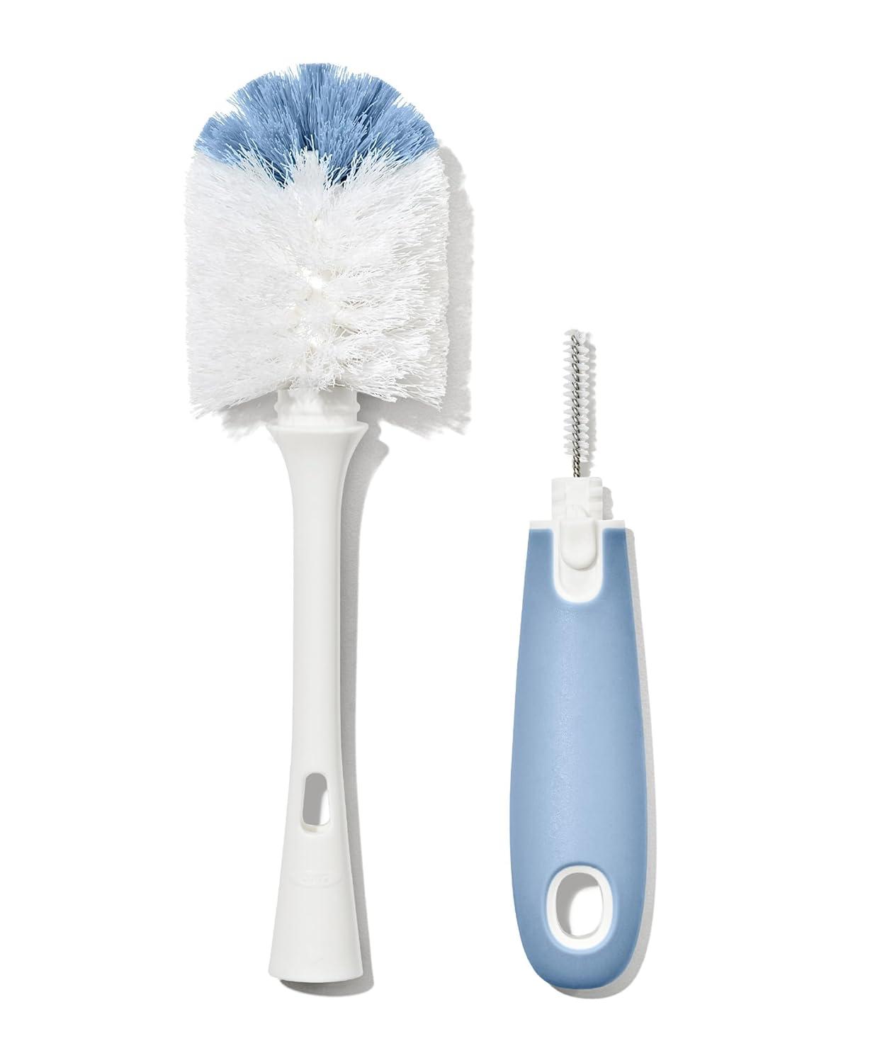The OXO Tot Bottle Brush with Stand is the ideal tool for cleaning baby bottles. Combining soft bristles for gentle cleaning and firm bristles for serious scrubbing, this handy bottle cleaner brush has a flexible neck to easily reach inside contoured bottles. The bottle cleaner brush bristles are durable and won't cause scratches. Replacement brush heads are available separately. The flexible handle features a nonslip grip so you can clean in comfort, even with wet hands. And the handle is firm, so it will hold up to serious scrubbing of baby bottles and breast pump parts. A hidden detail cleaner built into the handle is made of soft but sturdy silicone and is perfect for hitting tight spots inside bottle nipples and the like. Ventilation holes help the detail cleaner dry quickly. The OXO bottle brush fits easily in the stand for convenient, upright storage – keeping your countertop neat and the bottle scrubber easy to access when washing baby bottles and their parts. The bottle brush fits securely in the stand which catches drips to keep your countertop dry. The stand has a handy pour spout to dispose of drips and the stand twists apart for easy cleaning. This product is made without BPA, PVC or phthalates. Each OXO Tot product is tested in real homes with real parents and children (including our own) to ensure that we provide only the best-designed products possible. We proudly use these products daily and it is our sincere hope that they exceed your expectations.
