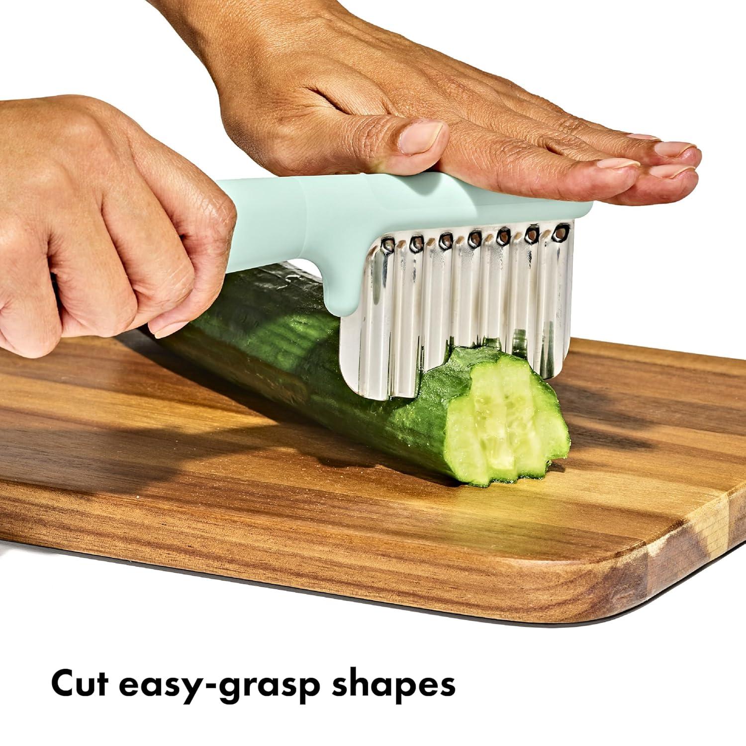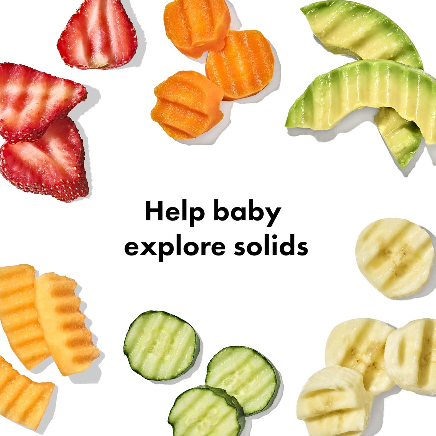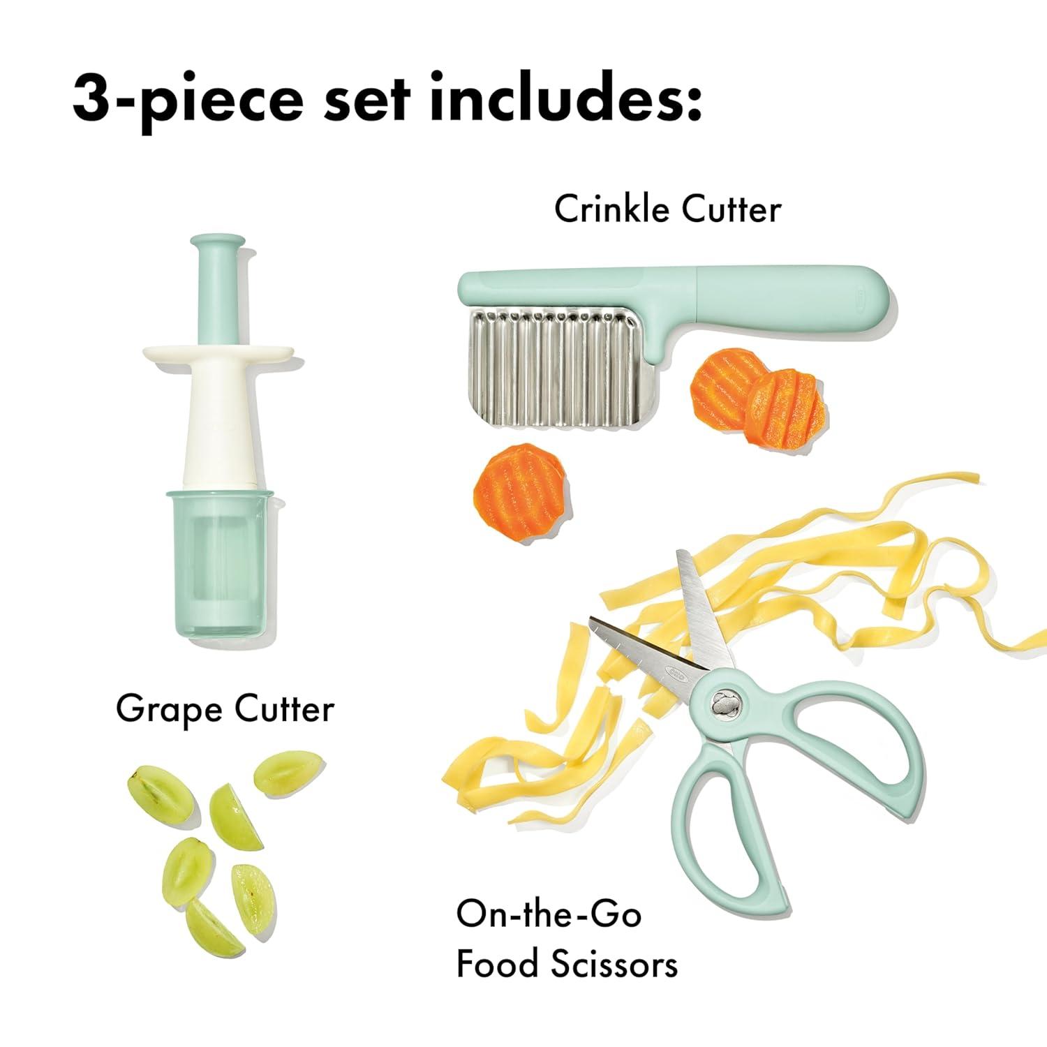 OXO Tot's Baby Food Prep Set includes baby feeding essentials and travel utensils in a compact baby solid starter kit, designed specifically to support baby led weaning. A baby feeding set with true versatility, OXO’s Tot Baby Food Prep Set includes three core pieces—the Best-Selling Grape Cutter, Crinkle Cutter (also referred to as Crinkle Food Cutter), and Baby Food Scissors. All OXO baby safety food cutter tools include multiple fruit slicer and vegetable chopper options for a well-stocked toddler kitchen. Multiple baby eating essentials options allow for the food chopper personalization that stimulates your little one as they practice new self-feeding skills. Designed for easy use at home and with travel, OXO’s baby utensils are carefully designed as a vegetable cutter or fruit slicer. The Crinkle Cutter and Baby Food Scissors create interesting textures and shapes for playful self-feeding. The Baby Food Scissors are compact and easy to use fruit and vegetable cutters for kids. The Grape Cutter transforms your little one’s favorite tiny round fruit and chops it into manageable portions, just right for them. Whether you’re in the market for a vegetable chopper, vegetable slicer, fruit slicer, food chopper, or simply want to spice things up with a crinkle cut knife for kids, OXO Tot has your baby led weaning food needs covered. OXO Tot products contain silicone baby materials.